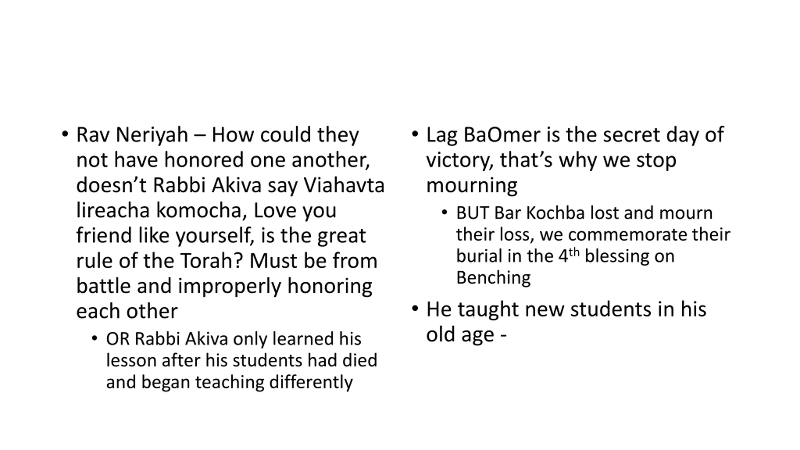 Rav Neriyah How could they not have honored one another, doesn t Rabbi Akiva say Viahavta lireacha komocha, Love you friend like yourself, is the great rule of the Torah? Must be from battle and improperly honoring each other OR Rabbi Akiva only learned his lesson after his students had died and began teaching differently Lag BaOmer is the secret day of victory, that s why we stop mourning BUT Bar Kochba lost and mourn their loss, we commemorate their burial in the 4thblessing on Benching He taught new students in his old age -