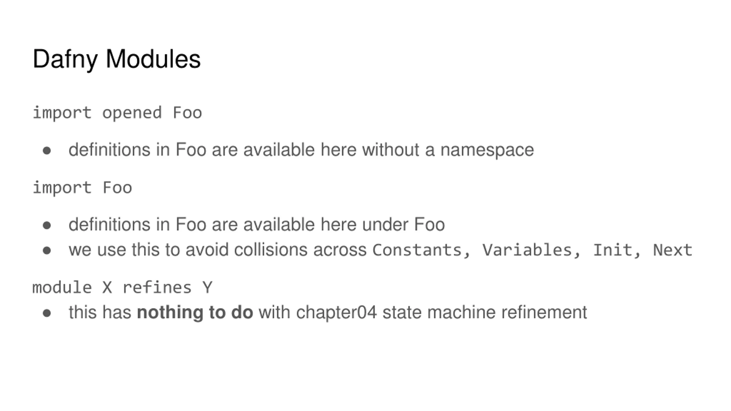 Dafny Modules import opened Foo definitions in Foo are available here without a namespace import Foo definitions in Foo are available here under Foo we use this to avoid collisions across Constants, Variables, Init, Next module X refines Y this has nothing to do with chapter04 state machine refinement
