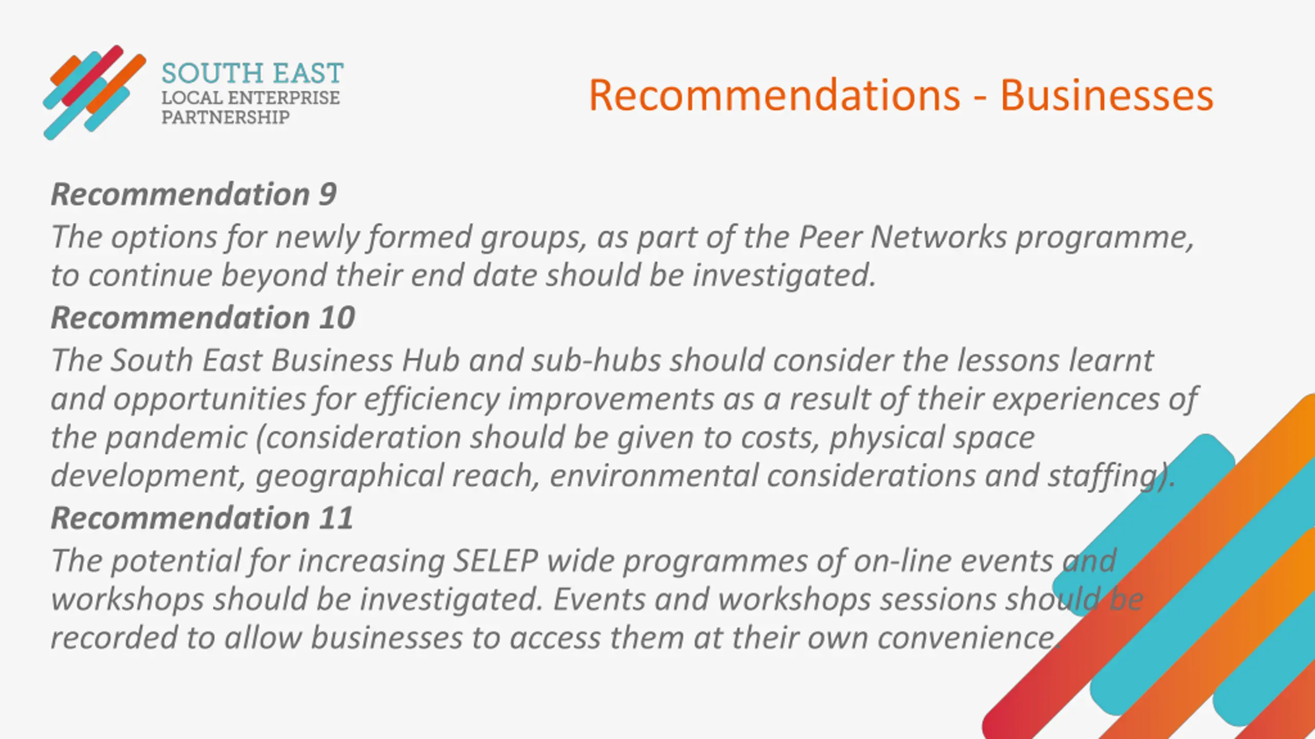 Recommendations - Businesses Recommendation 9 The options for newly formed groups, as part of the Peer Networks programme, to continue beyond their end date should be investigated. Recommendation 10 The South East Business Hub and sub-hubs should consider the lessons learnt and opportunities for efficiency improvements as a result of their experiences of the pandemic (consideration should be given to costs, physical space development, geographical reach, environmental considerations and staffing). Recommendation 11 The potential for increasing SELEP wide programmes of on-line events and workshops should be investigated. Events and workshops sessions should be recorded to allow businesses to access them at their own convenience.