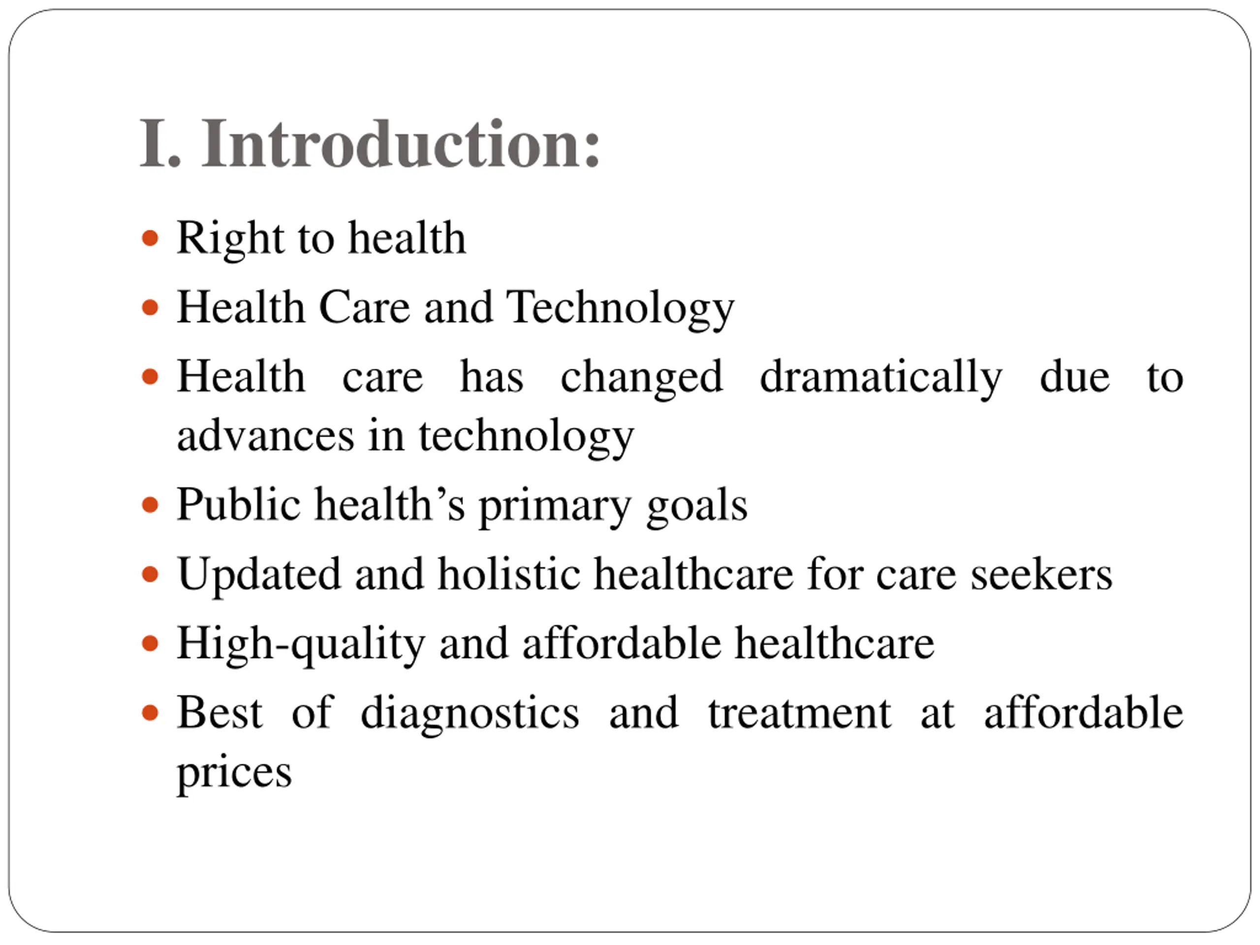 I. Introduction: Right to health Health Care and Technology Health care has changed dramatically due to advances in technology Public health s primary goals Updated and holistic healthcare for care seekers High-quality and affordable healthcare Best of diagnostics and treatment at affordable prices