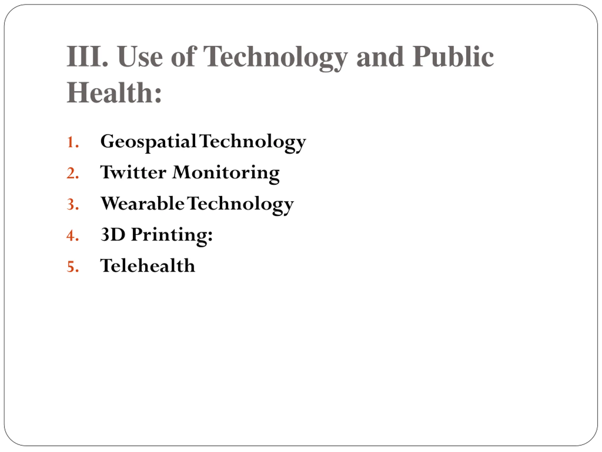 III. Use of Technology and Public Health: Geospatial Technology Twitter Monitoring Wearable Technology 3D Printing: Telehealth 1. 2. 3. 4. 5.