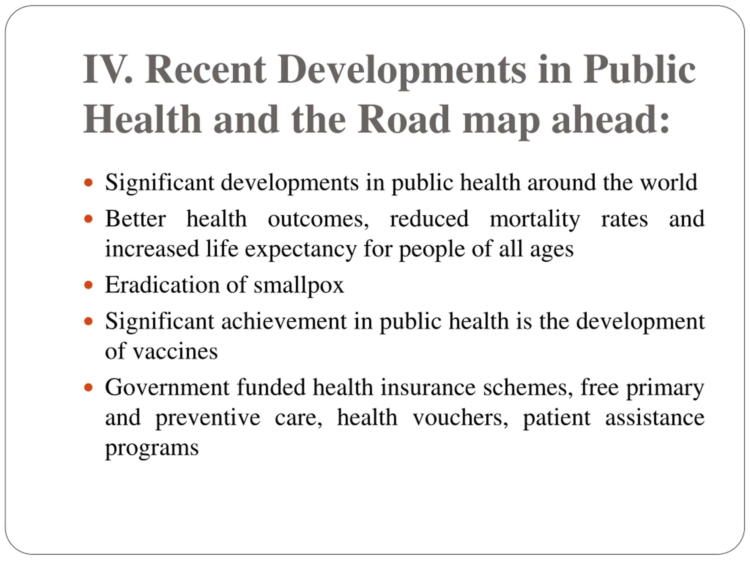 IV. Recent Developments in Public Health and the Road map ahead: Significant developments in public health around the world Better health outcomes, reduced mortality rates and increased life expectancy for people of all ages Eradication of smallpox Significant achievement in public health is the development of vaccines Government funded health insurance schemes, free primary and preventive care, health vouchers, patient assistance programs