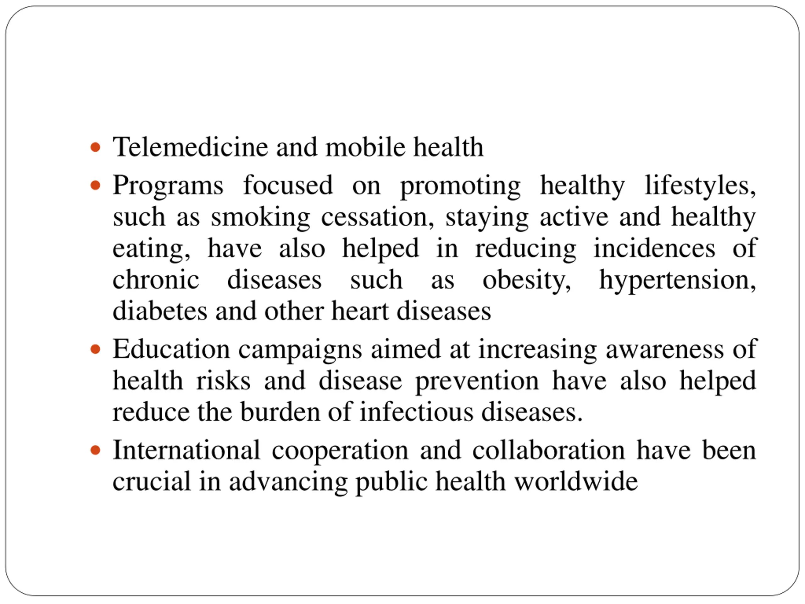 Telemedicine and mobile health Programs focused on promoting healthy lifestyles, such as smoking cessation, staying active and healthy eating, have also helped in reducing incidences of chronic diseases such diabetes and other heart diseases Education campaigns aimed at increasing awareness of health risks and disease prevention have also helped reduce the burden of infectious diseases. International cooperation and collaboration have been crucial in advancing public health worldwide as obesity, hypertension,