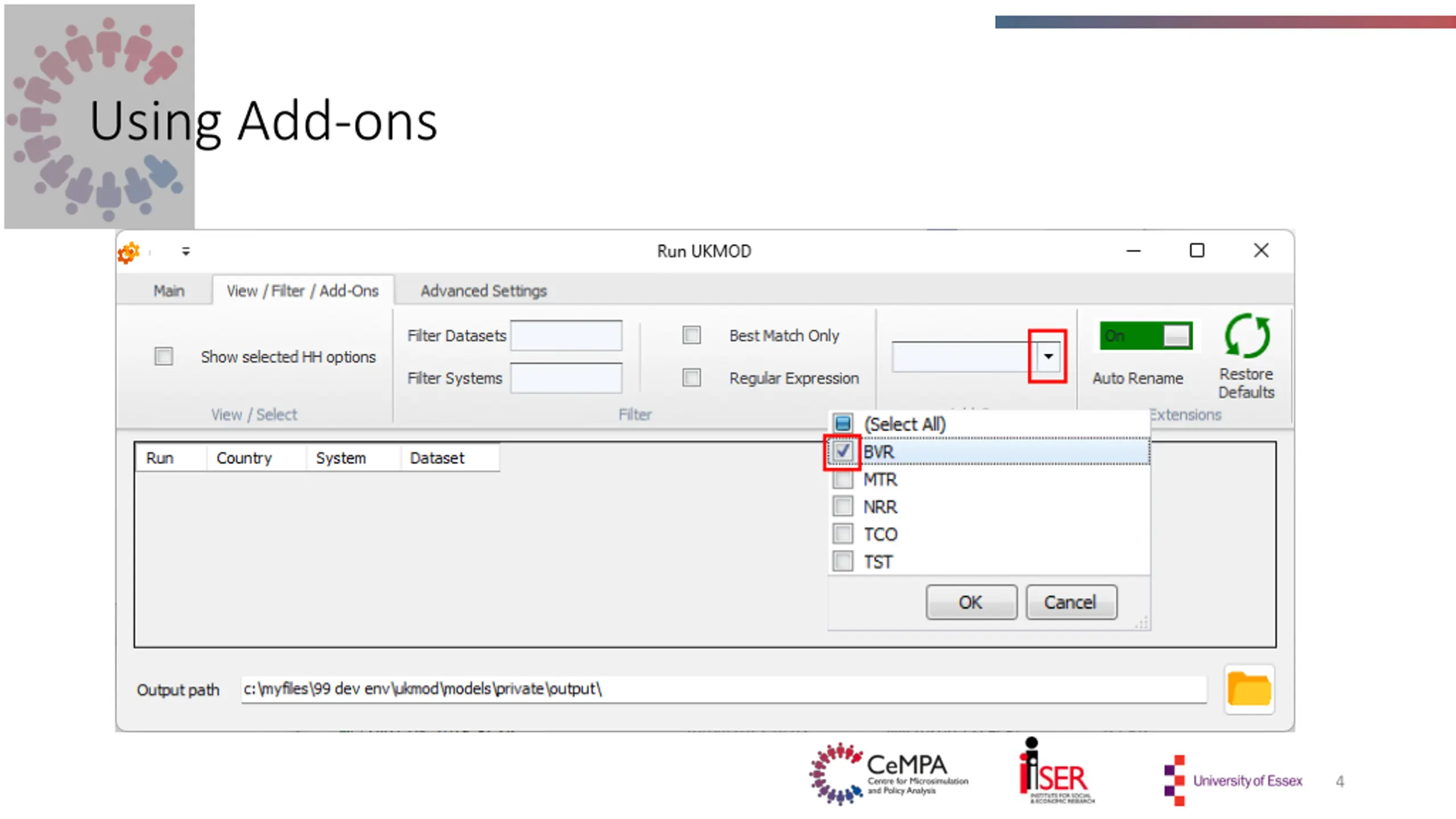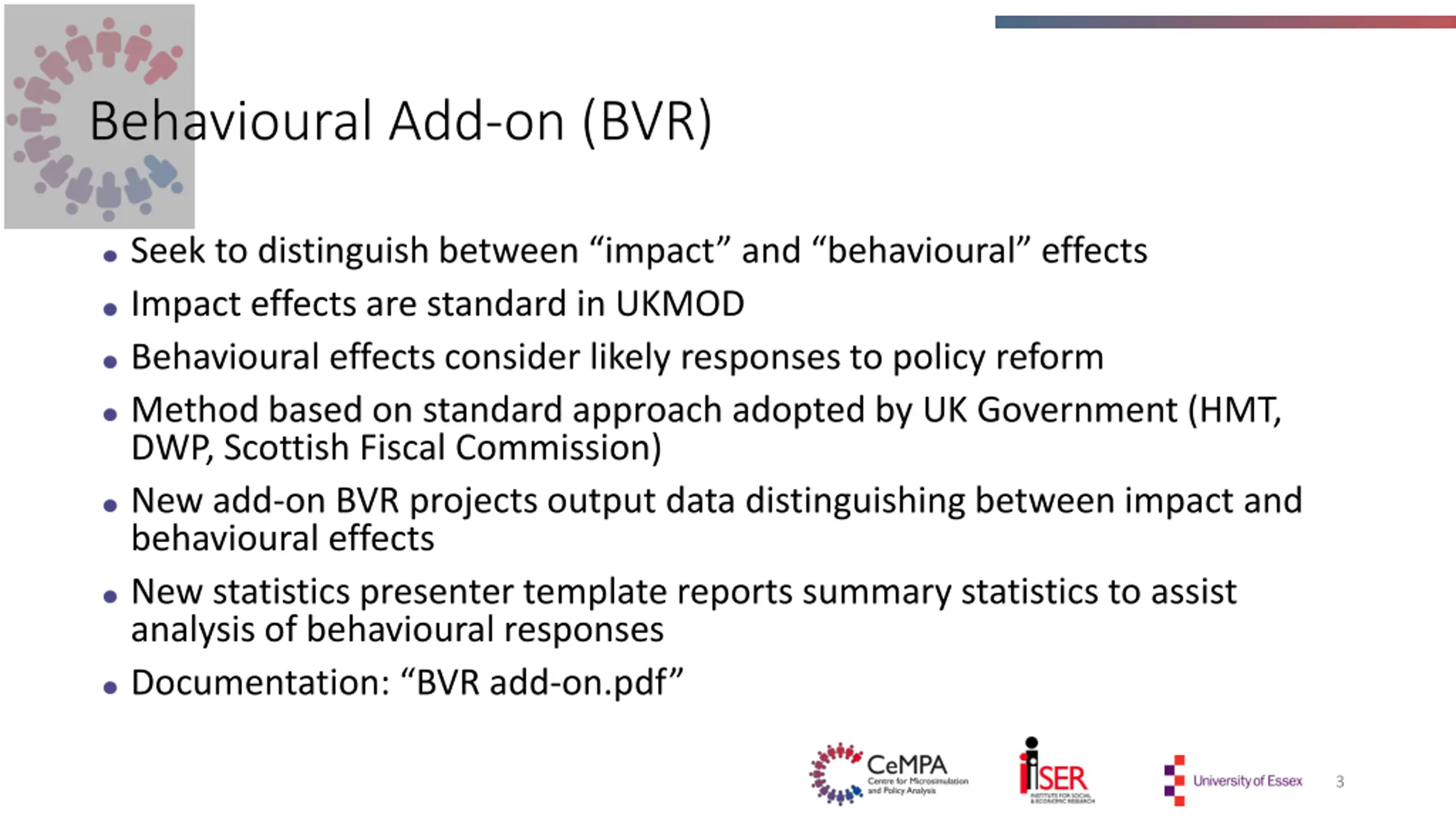 Behavioural Add-on (BVR) Seek to distinguish between impact and behavioural effects Impact effects are standard in UKMOD Behavioural effects consider likely responses to policy reform Method based on standard approach adopted by UK Government (HMT, DWP, Scottish Fiscal Commission) New add-on BVR projects output data distinguishing between impact and behavioural effects New statistics presenter template reports summary statistics to assist analysis of behavioural responses Documentation: BVR add-on.pdf 3