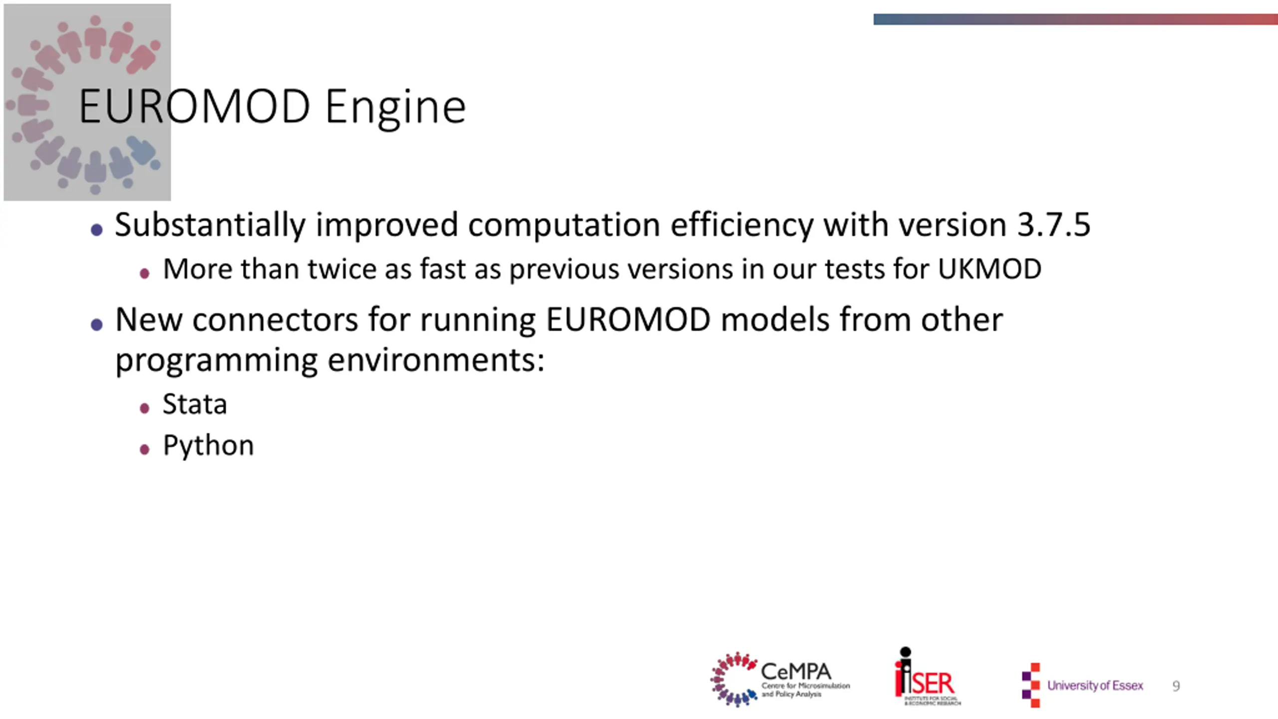 EUROMOD Engine Substantially improved computation efficiency with version 3.7.5 More than twice as fast as previous versions in our tests for UKMOD New connectors for running EUROMOD models from other programming environments: Stata Python 9