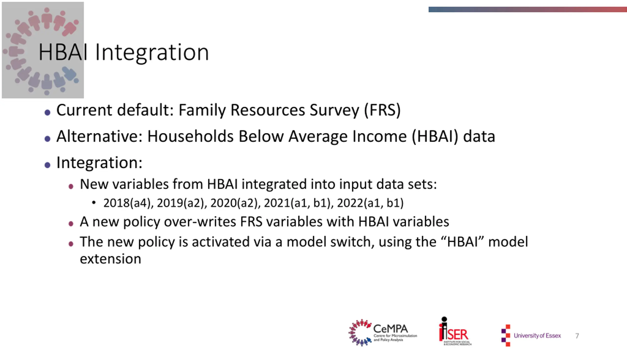 HBAI Integration Current default: Family Resources Survey (FRS) Alternative: Households Below Average Income (HBAI) data Integration: New variables from HBAI integrated into input data sets: 2018(a4), 2019(a2), 2020(a2), 2021(a1, b1), 2022(a1, b1) A new policy over-writes FRS variables with HBAI variables The new policy is activated via a model switch, using the HBAI model extension 7