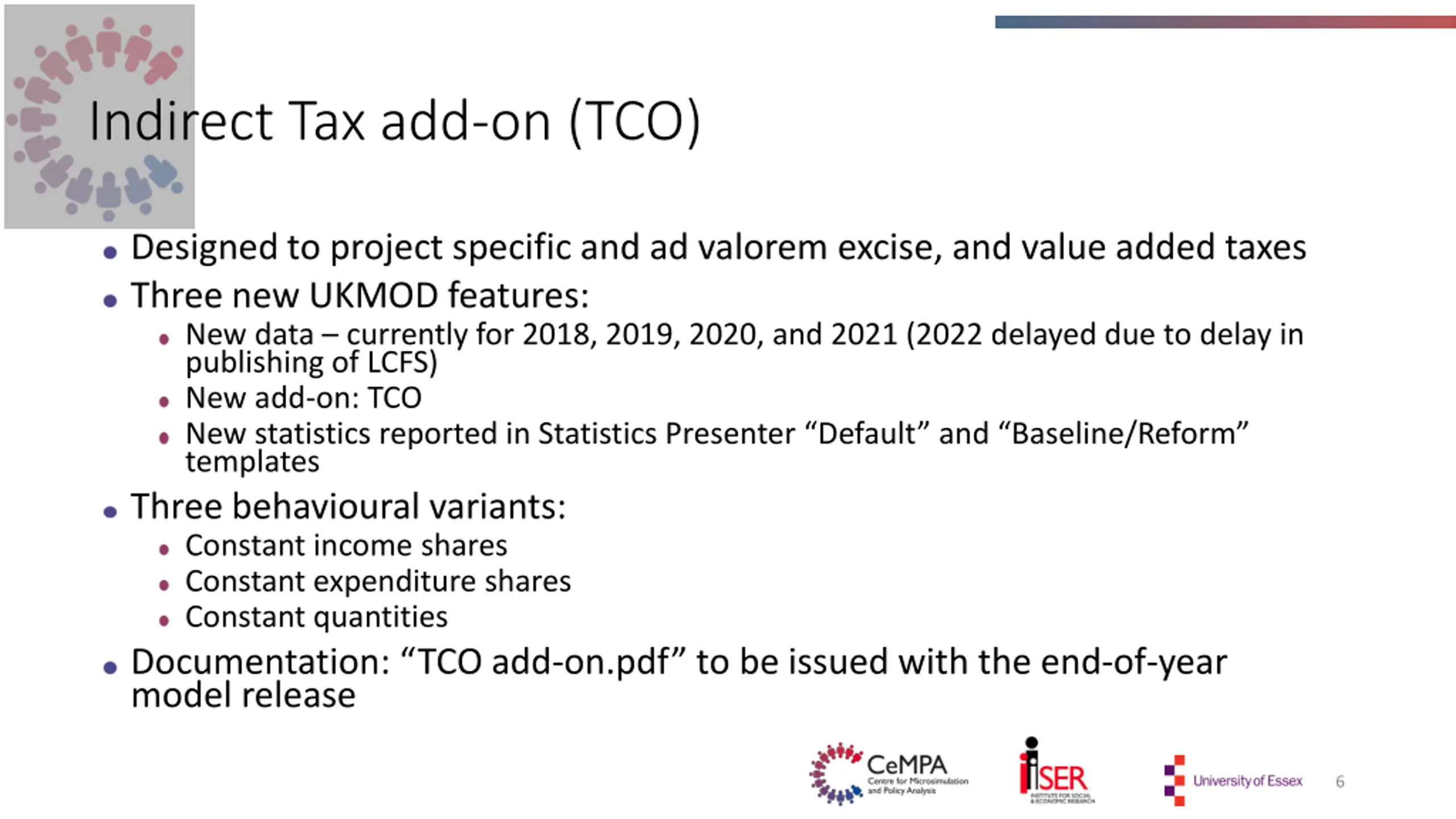 Indirect Tax add-on (TCO) Designed to project specific and ad valorem excise, and value added taxes Three new UKMOD features: New data currently for 2018, 2019, 2020, and 2021 (2022 delayed due to delay in publishing of LCFS) New add-on: TCO New statistics reported in Statistics Presenter Default and Baseline/Reform templates Three behavioural variants: Constant income shares Constant expenditure shares Constant quantities Documentation: TCO add-on.pdf to be issued with the end-of-year model release 6