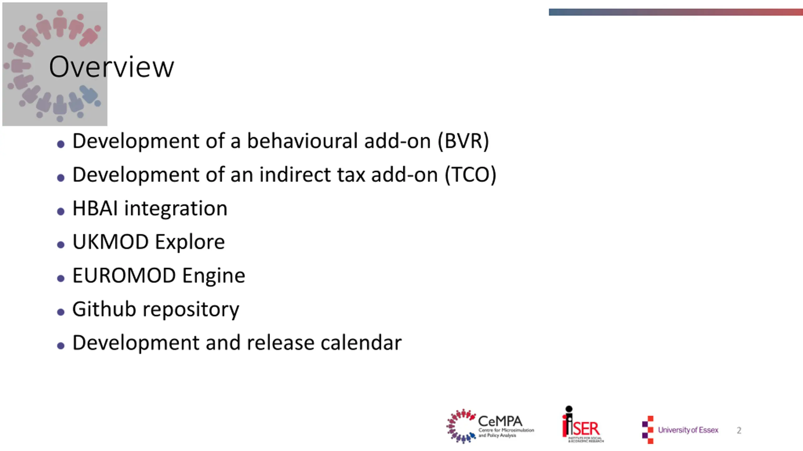 Overview Development of a behavioural add-on (BVR) Development of an indirect tax add-on (TCO) HBAI integration UKMOD Explore EUROMOD Engine Github repository Development and release calendar 2