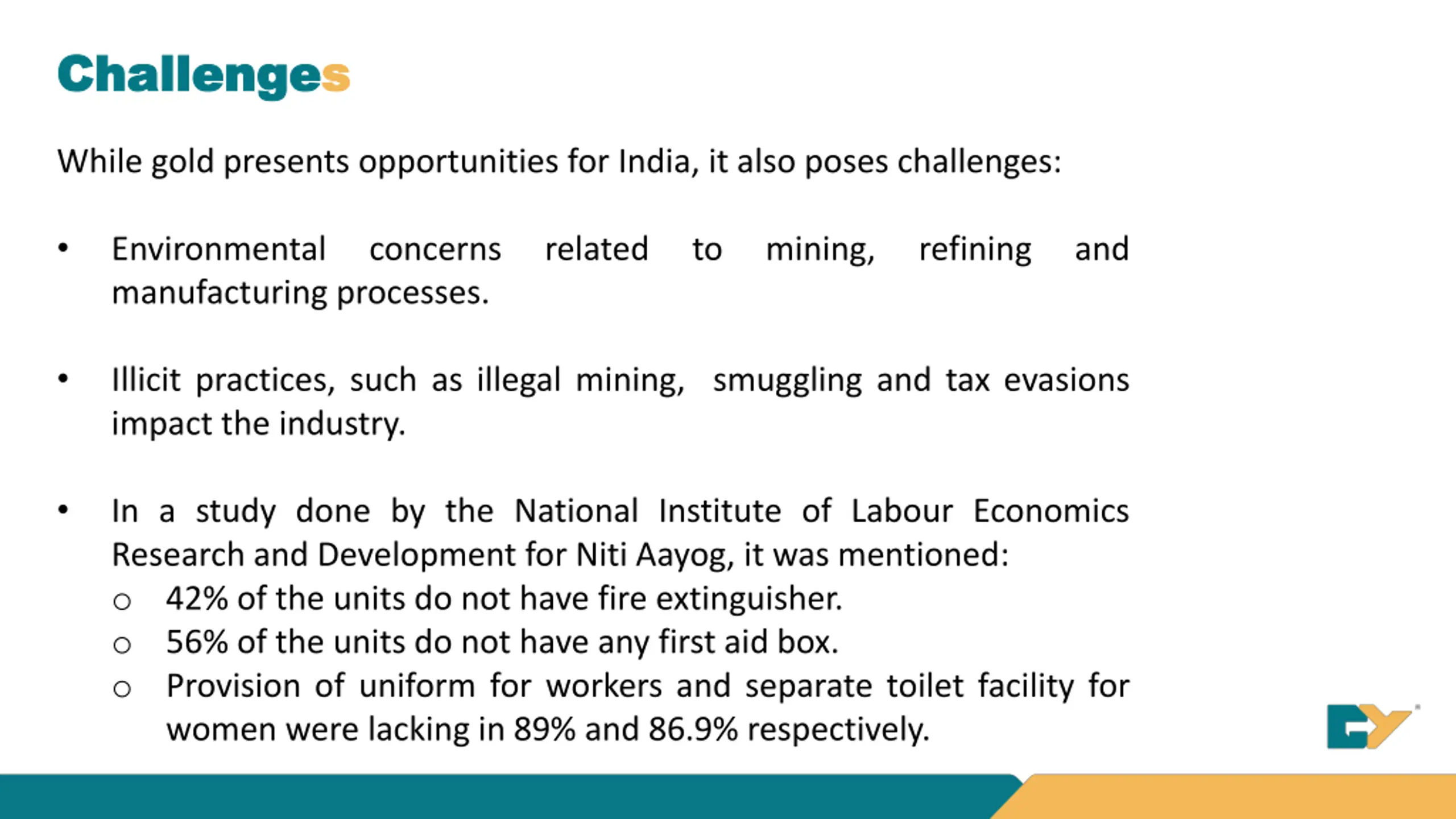 Challenge Challenges s While gold presents opportunities for India, it also poses challenges: Environmental manufacturing processes. concerns related to mining, refining and Illicit practices, such as illegal mining, smuggling and tax evasions impact the industry. In a study done by the National Institute of Labour Economics Research and Development for Niti Aayog, it was mentioned: o 42% of the units do not have fire extinguisher. o 56% of the units do not have any first aid box. o Provision of uniform for workers and separate toilet facility for women were lacking in 89% and 86.9% respectively.
