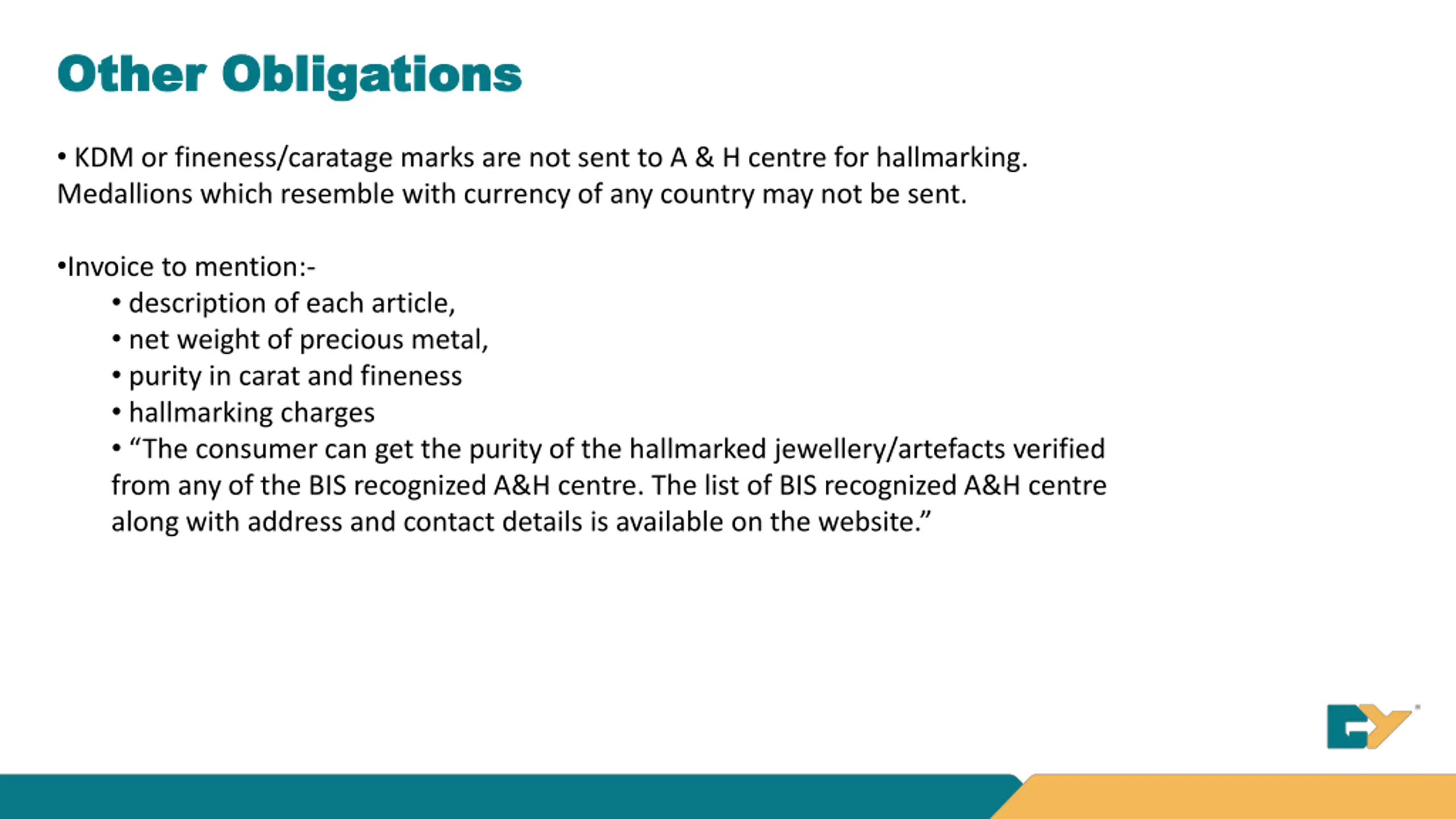 Other Obligations Other Obligations KDM or fineness/caratage marks are not sent to A & H centre for hallmarking. Medallions which resemble with currency of any country may not be sent. Invoice to mention:- description of each article, net weight of precious metal, purity in carat and fineness hallmarking charges The consumer can get the purity of the hallmarked jewellery/artefacts verified from any of the BIS recognized A&H centre. The list of BIS recognized A&H centre along with address and contact details is available on the website.
