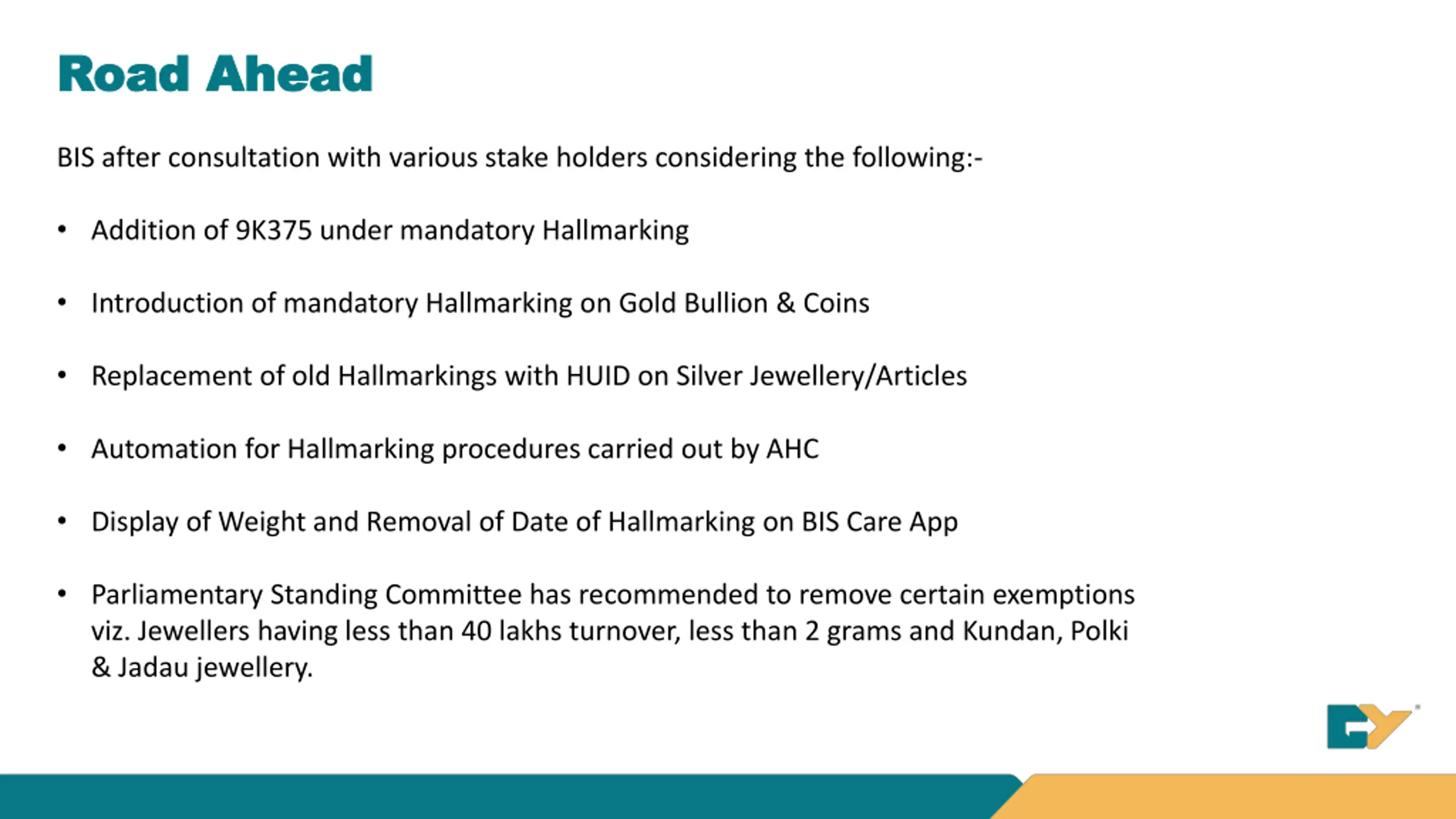 Road Ahead Road Ahead BIS after consultation with various stake holders considering the following:- Addition of 9K375 under mandatory Hallmarking Introduction of mandatory Hallmarking on Gold Bullion & Coins Replacement of old Hallmarkings with HUID on Silver Jewellery/Articles Automation for Hallmarking procedures carried out by AHC Display of Weight and Removal of Date of Hallmarking on BIS Care App Parliamentary Standing Committee has recommended to remove certain exemptions viz. Jewellers having less than 40 lakhs turnover, less than 2 grams and Kundan, Polki & Jadau jewellery.