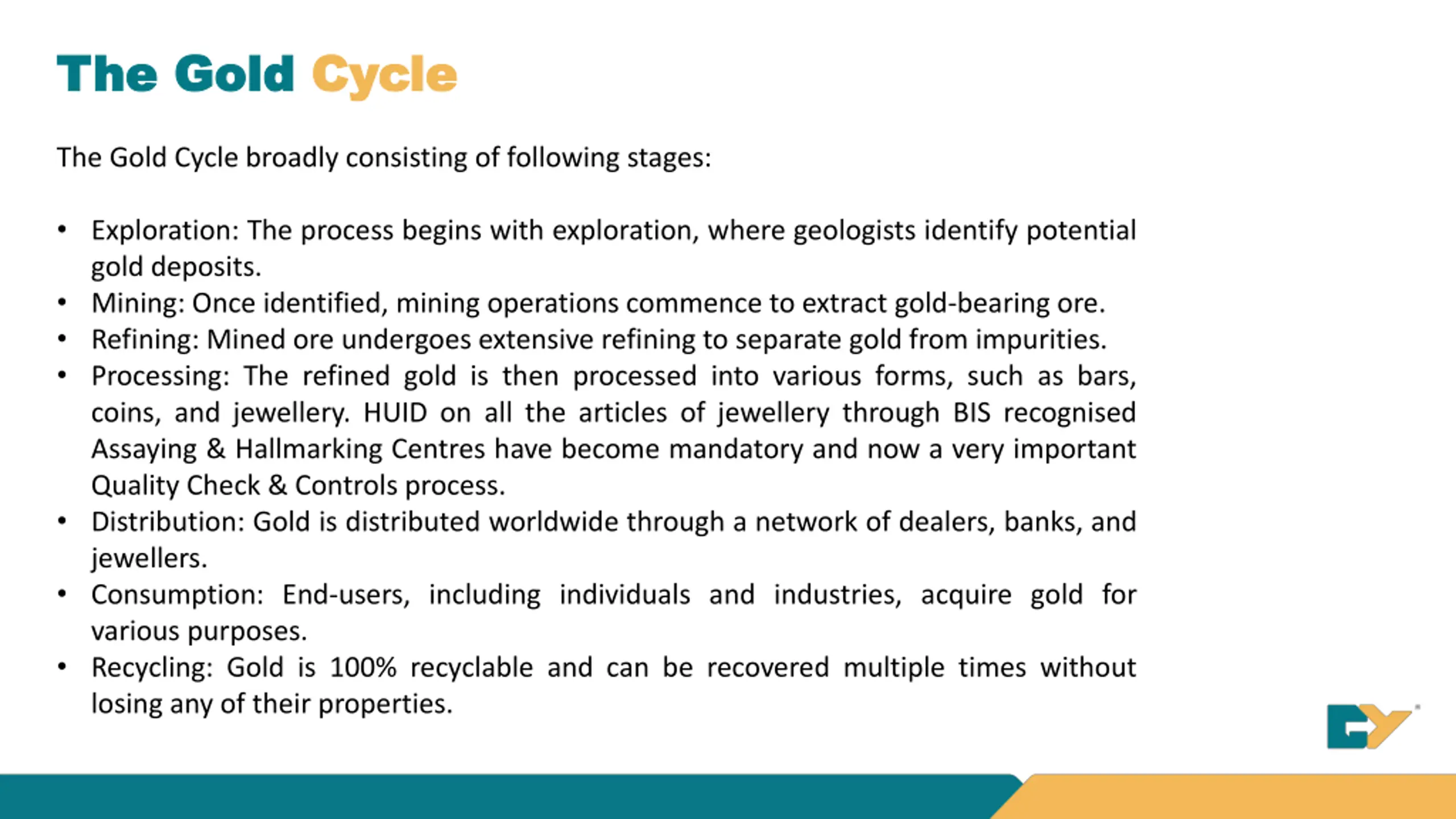 The Gold The Gold Cycle Cycle The Gold Cycle broadly consisting of following stages: Exploration: The process begins with exploration, where geologists identify potential gold deposits. Mining: Once identified, mining operations commence to extract gold-bearing ore. Refining: Mined ore undergoes extensive refining to separate gold from impurities. Processing: The refined gold is then processed into various forms, such as bars, coins, and jewellery. HUID on all the articles of jewellery through BIS recognised Assaying & Hallmarking Centres have become mandatory and now a very important Quality Check & Controls process. Distribution: Gold is distributed worldwide through a network of dealers, banks, and jewellers. Consumption: End-users, including individuals and industries, acquire gold for various purposes. Recycling: Gold is 100% recyclable and can be recovered multiple times without losing any of their properties.