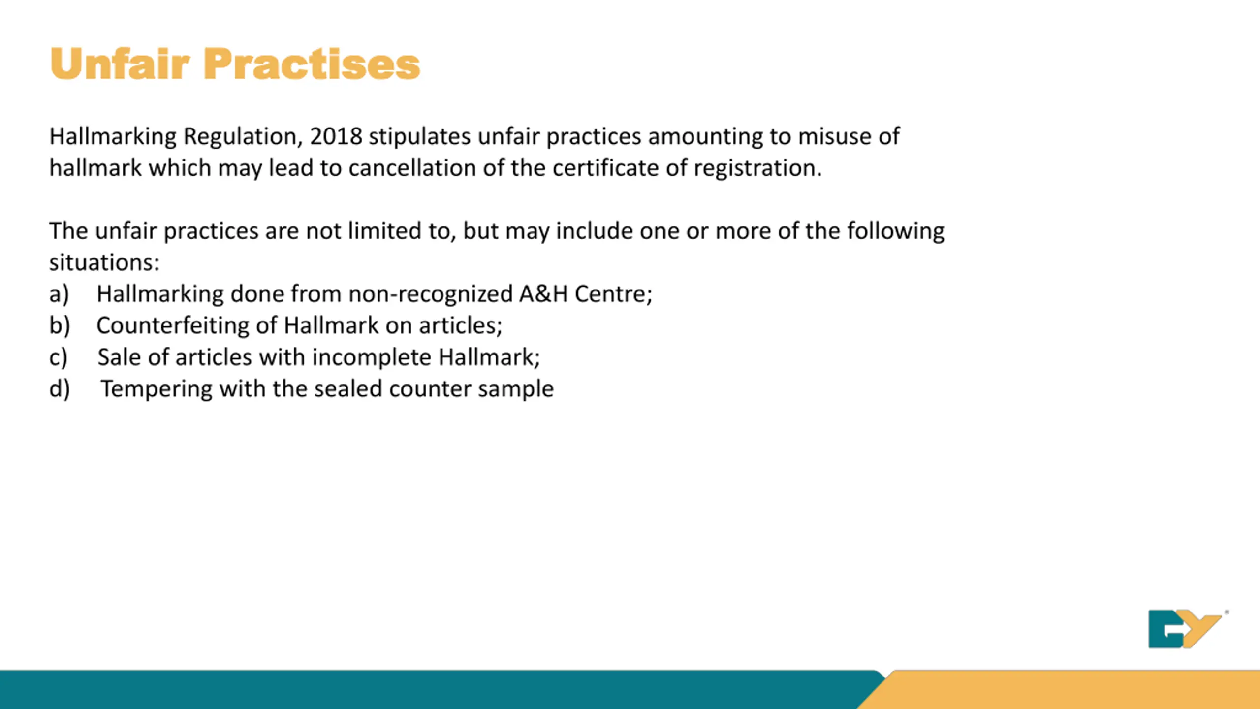 Unfair Practises Unfair Practises Hallmarking Regulation, 2018 stipulates unfair practices amounting to misuse of hallmark which may lead to cancellation of the certificate of registration. The unfair practices are not limited to, but may include one or more of the following situations: a) Hallmarking done from non-recognized A&H Centre; b) Counterfeiting of Hallmark on articles; c) Sale of articles with incomplete Hallmark; d) Tempering with the sealed counter sample