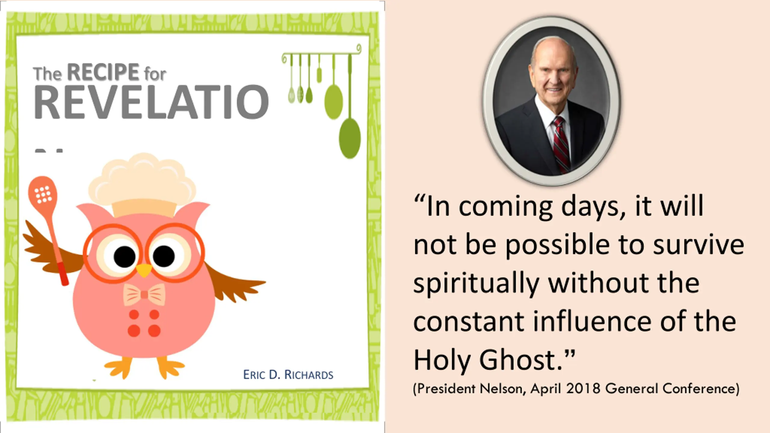 The RECIPE for REVELATIO N In coming days, it will not be possible to survive spiritually without the constant influence of the Holy Ghost. (President Nelson, April 2018 General Conference) ERIC D. RICHARDS