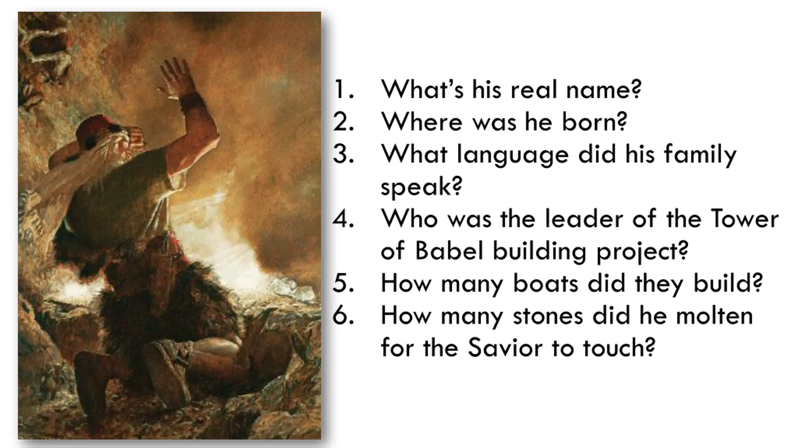 1. Whats his real name? 2. Where was he born? 3. What language did his family speak? 4. Who was the leader of the Tower of Babel building project? 5. How many boats did they build? 6. How many stones did he molten for the Savior to touch?