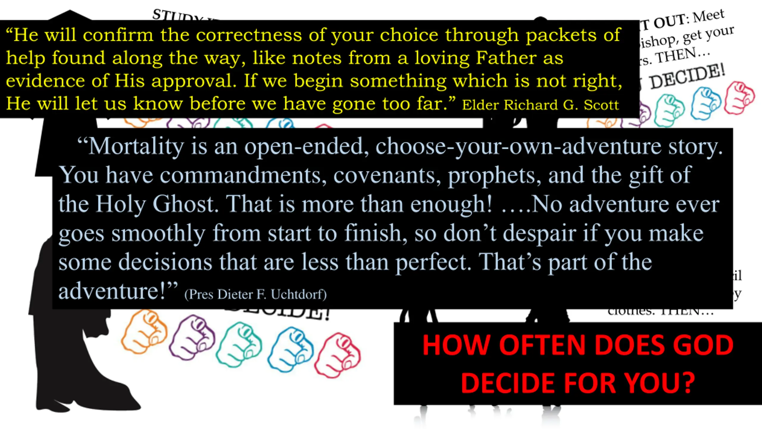 He will confirm the correctness of your choice through packets of help found along the way, like notes from a loving Father as evidence of His approval. If we begin something which is not right, He will let us know before we have gone too far. Elder Richard G. Scott Mortality is an open-ended, choose-your-own-adventure story. You have commandments, covenants, prophets, and the gift of the Holy Ghost. That is more than enough! .No adventure ever goes smoothly from start to finish, so don t despair if you make some decisions that are less than perfect. That s part of the adventure! (Pres Dieter F. Uchtdorf) STUDY IT OUT: Council with spouse, look at baby clothes. THEN HOW OFTEN DOES GOD DECIDE FOR YOU?