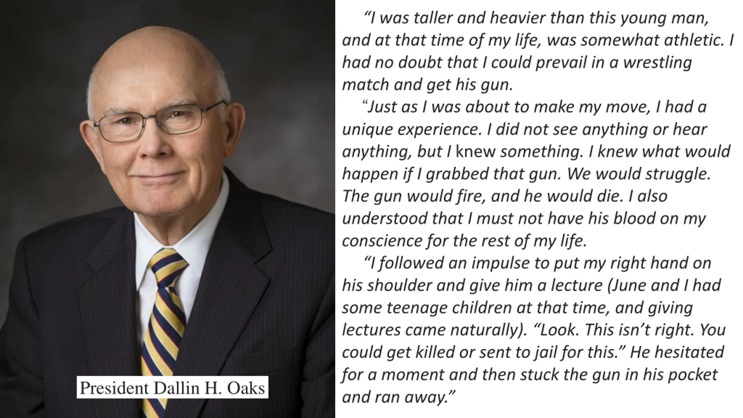 I was taller and heavier than this young man, and at that time of my life, was somewhat athletic. I had no doubt that I could prevail in a wrestling match and get his gun. Just as I was about to make my move, I had a unique experience. I did not see anything or hear anything, but I knew something. I knew what would happen if I grabbed that gun. We would struggle. The gun would fire, and he would die. I also understood that I must not have his blood on my conscience for the rest of my life. I followed an impulse to put my right hand on his shoulder and give him a lecture (June and I had some teenage children at that time, and giving lectures came naturally). Look. This isn t right. You could get killed or sent to jail for this. He hesitated for a moment and then stuck the gun in his pocket and ran away. President Dallin H. Oaks