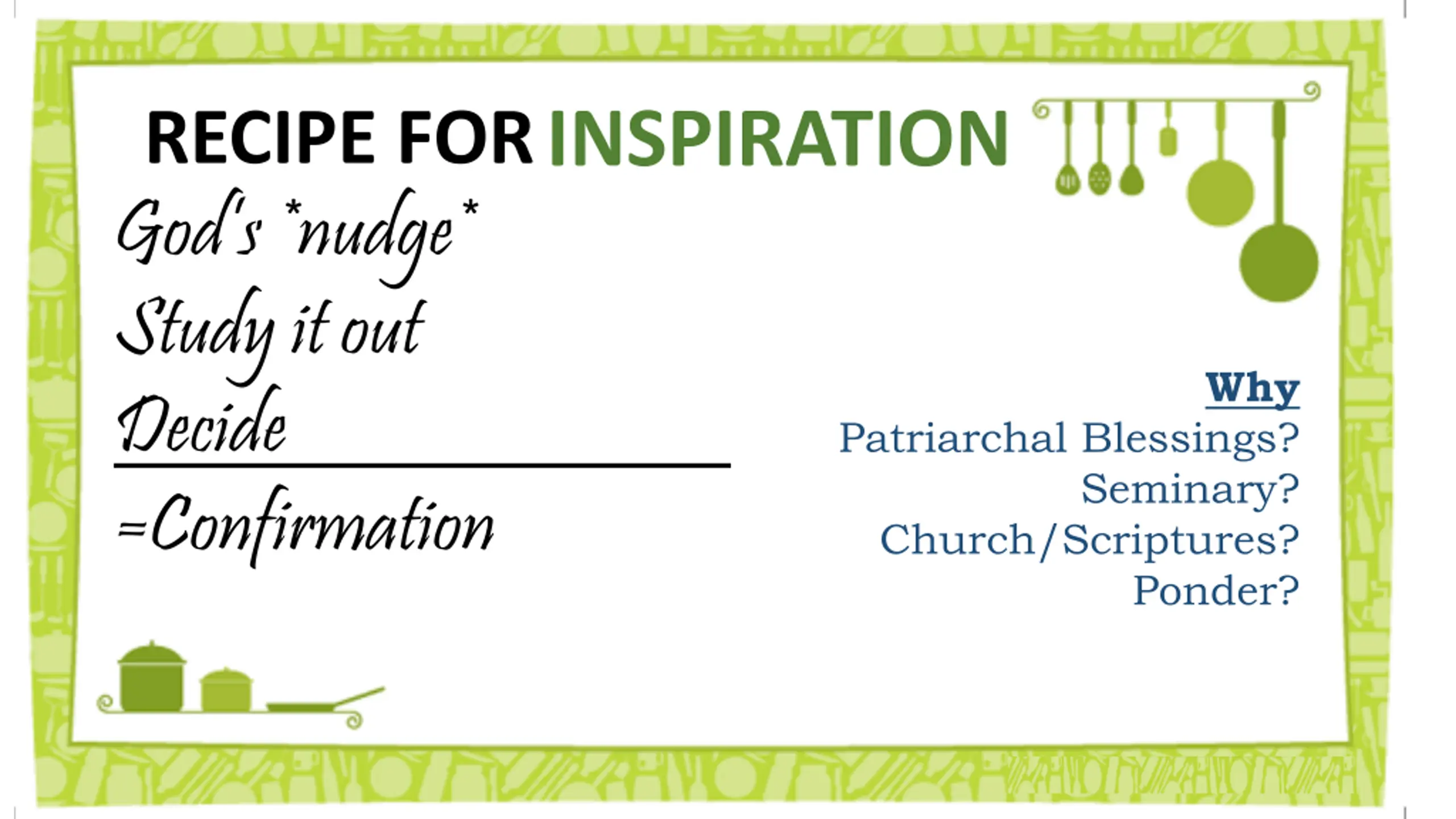 INSPIRATION RECIPE FOR God s *nudge* Study it out Decide . =Confirmation Why Patriarchal Blessings? Seminary? Church/Scriptures? Ponder?