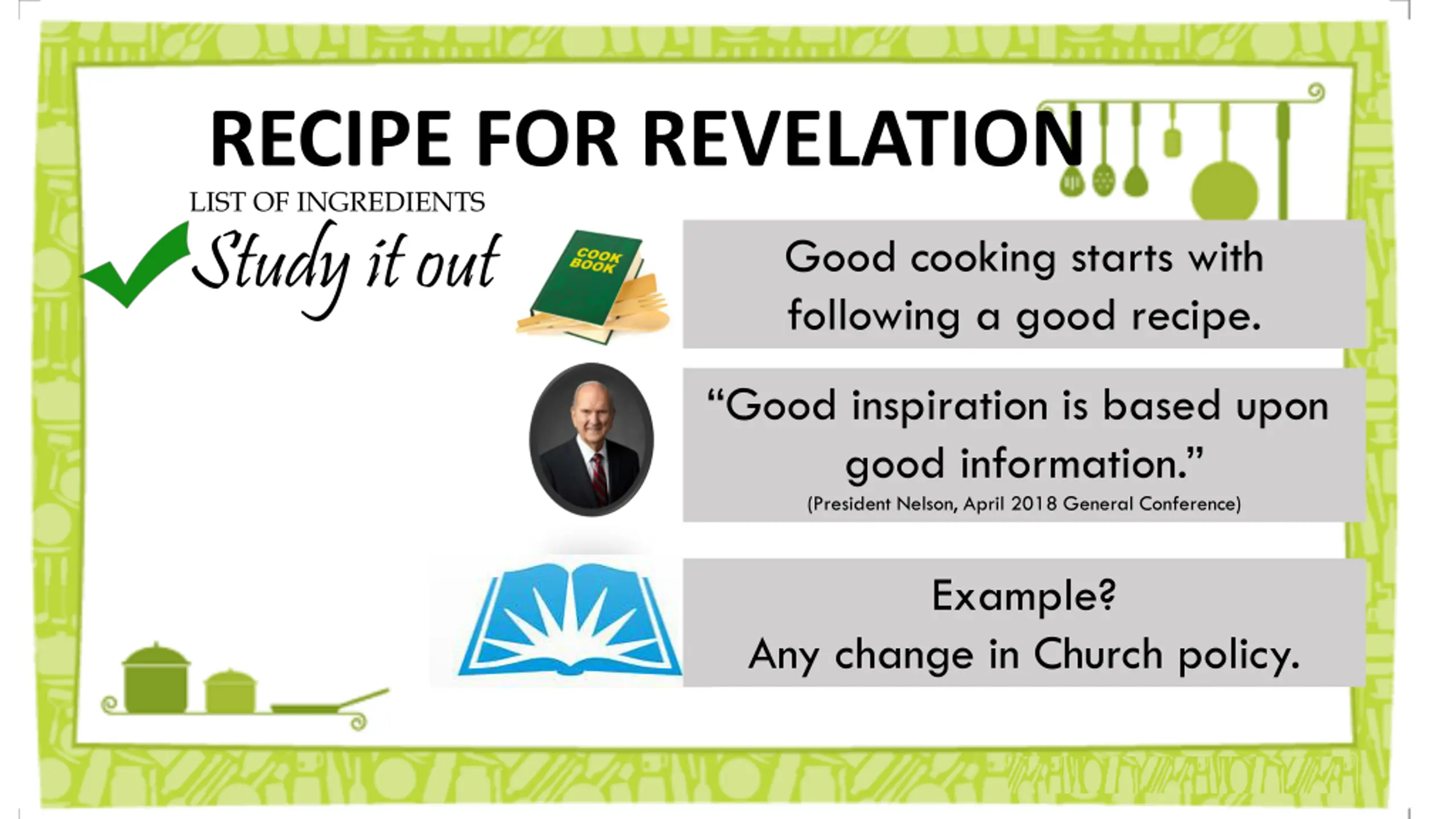 RECIPE FOR REVELATION LIST OF INGREDIENTS Study it out Good cooking starts with following a good recipe. Good inspiration is based upon good information. (President Nelson, April 2018 General Conference) Example? Any change in Church policy.