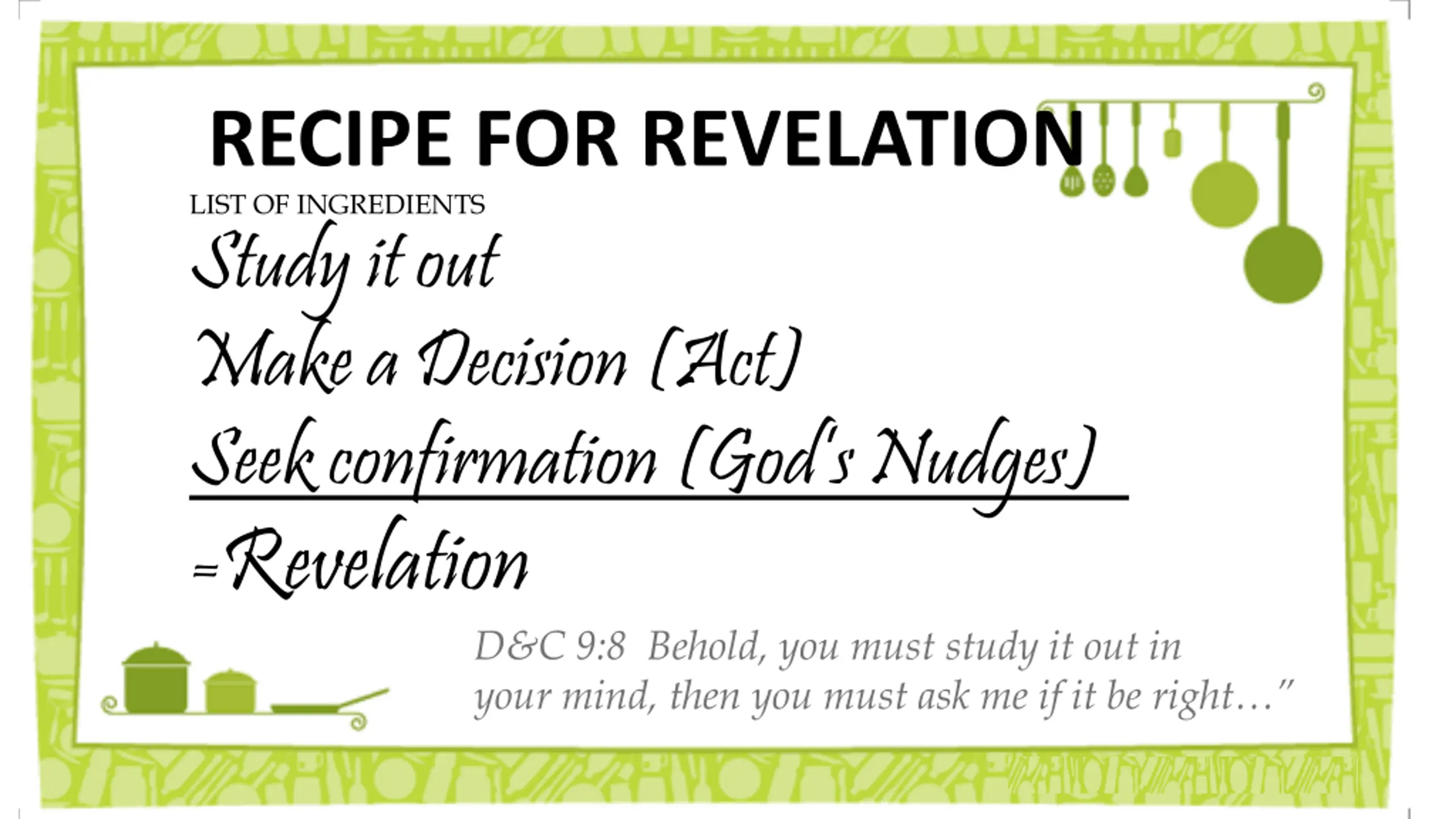 RECIPE FOR REVELATION LIST OF INGREDIENTS Study it out Make a Decision (Act) Seek confirmation (God s Nudges) . =Revelation D&C 9:8 Behold, you must study it out in your mind, then you must ask me if it be right
