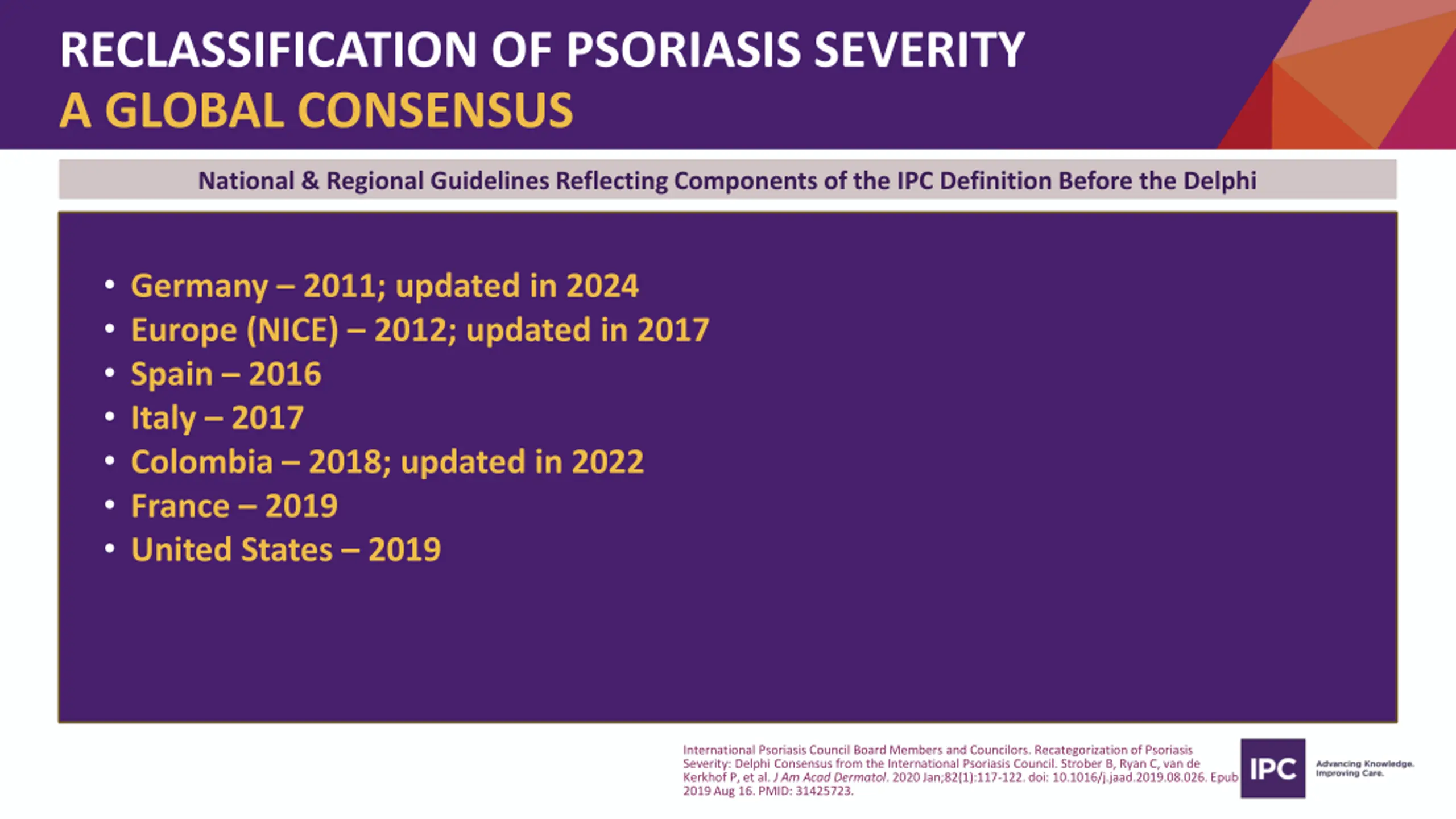 RECLASSIFICATION OF PSORIASIS SEVERITY A GLOBAL CONSENSUS National & Regional Guidelines Reflecting Components of the IPC Definition Before the Delphi Germany 2011; updated in 2024 Europe (NICE) 2012; updated in 2017 Spain 2016 Italy 2017 Colombia 2018; updated in 2022 France 2019 United States 2019 International Psoriasis Council Board Members and Councilors. Recategorization of Psoriasis Severity: Delphi Consensus from the International Psoriasis Council. Strober B, Ryan C, van de Kerkhof P, et al. J Am Acad Dermatol. 2020 Jan;82(1):117-122. doi: 10.1016/j.jaad.2019.08.026. Epub 2019 Aug 16. PMID: 31425723.