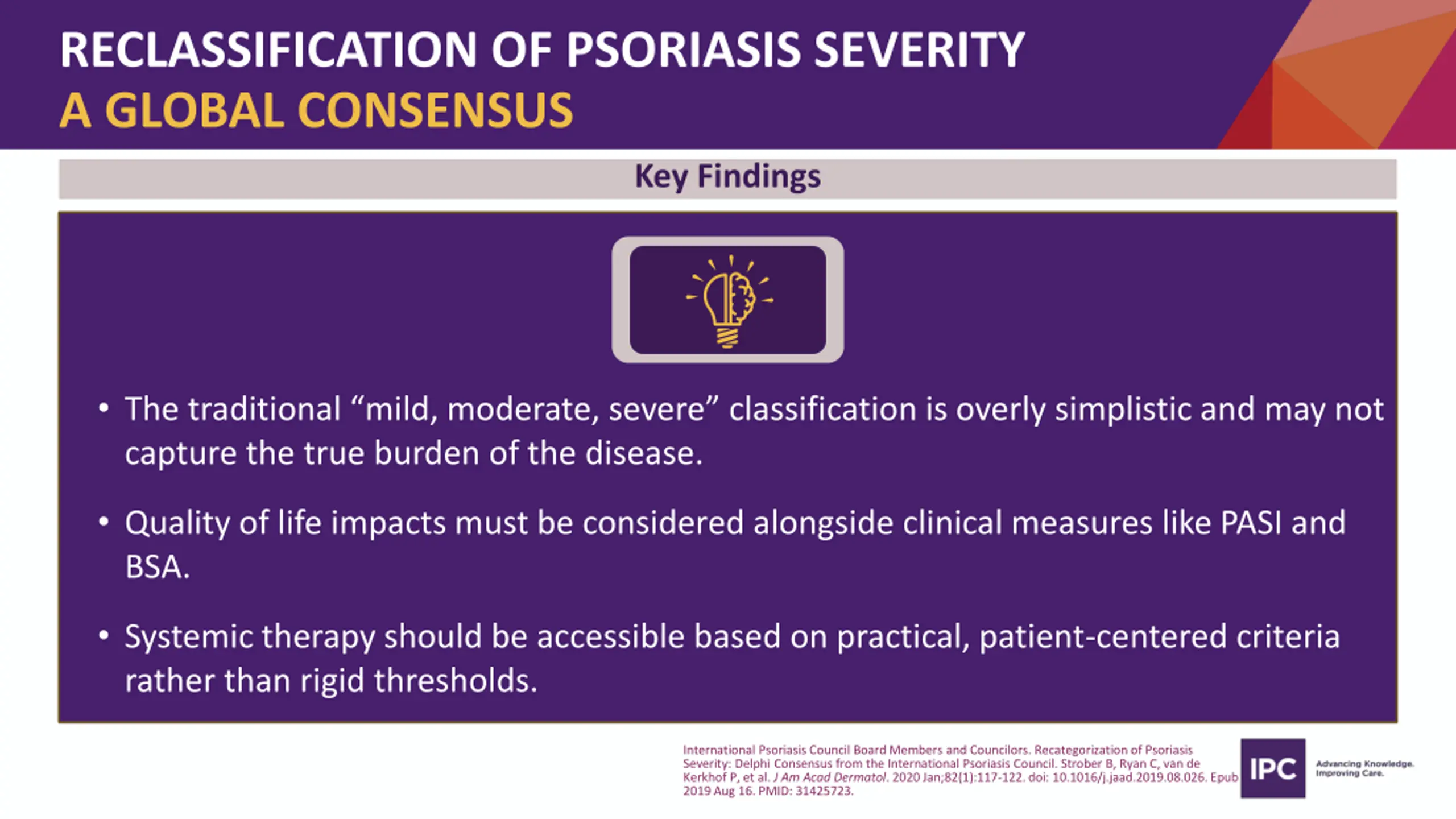 RECLASSIFICATION OF PSORIASIS SEVERITY A GLOBAL CONSENSUS Impact and Meaning Broader Access to Treatments: Ensures more patients receive appropriate therapy, even if they don t meet traditional PASI/BSA thresholds. Patient-Centered: Considers quality-of-life impact beyond clinical scores. Clinical Relevance: Aligns treatment decisions with the true burden of disease. International Psoriasis Council Board Members and Councilors. Recategorization of Psoriasis Severity: Delphi Consensus from the International Psoriasis Council. Strober B, Ryan C, van de Kerkhof P, et al. J Am Acad Dermatol. 2020 Jan;82(1):117-122. doi: 10.1016/j.jaad.2019.08.026. Epub 2019 Aug 16. PMID: 31425723.
