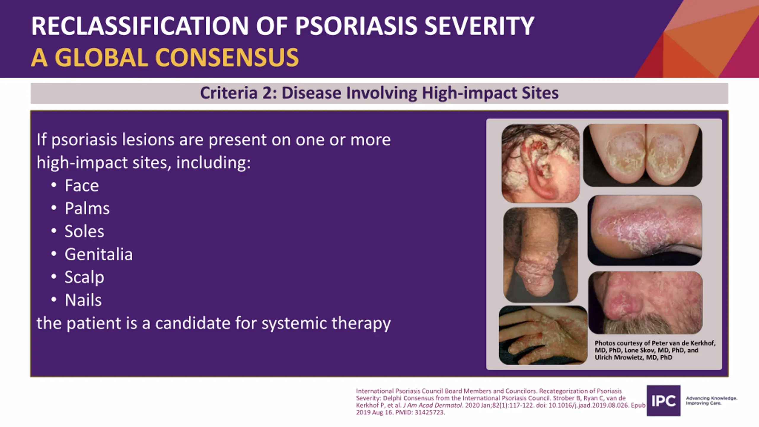 RECLASSIFICATION OF PSORIASIS SEVERITY A GLOBAL CONSENSUS Criteria 2: Disease Involving High-impact Sites If psoriasis lesions are present on one or more high-impact sites, including: Face Palms Soles Genitalia Scalp Nails the patient is a candidate for systemic therapy Photos courtesy of Peter van de Kerkhof, MD, PhD, Lone Skov, MD, PhD, and Ulrich Mrowietz, MD, PhD International Psoriasis Council Board Members and Councilors. Recategorization of Psoriasis Severity: Delphi Consensus from the International Psoriasis Council. Strober B, Ryan C, van de Kerkhof P, et al. J Am Acad Dermatol. 2020 Jan;82(1):117-122. doi: 10.1016/j.jaad.2019.08.026. Epub 2019 Aug 16. PMID: 31425723.