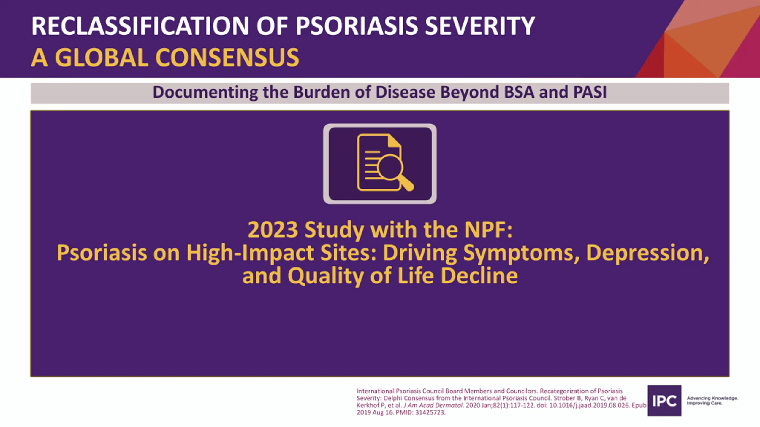 RECLASSIFICATION OF PSORIASIS SEVERITY A GLOBAL CONSENSUS Documenting the Burden of Disease Beyond BSA and PASI 2023 Study with the NPF: Psoriasis on High-Impact Sites: Driving Symptoms, Depression, and Quality of Life Decline International Psoriasis Council Board Members and Councilors. Recategorization of Psoriasis Severity: Delphi Consensus from the International Psoriasis Council. Strober B, Ryan C, van de Kerkhof P, et al. J Am Acad Dermatol. 2020 Jan;82(1):117-122. doi: 10.1016/j.jaad.2019.08.026. Epub 2019 Aug 16. PMID: 31425723.