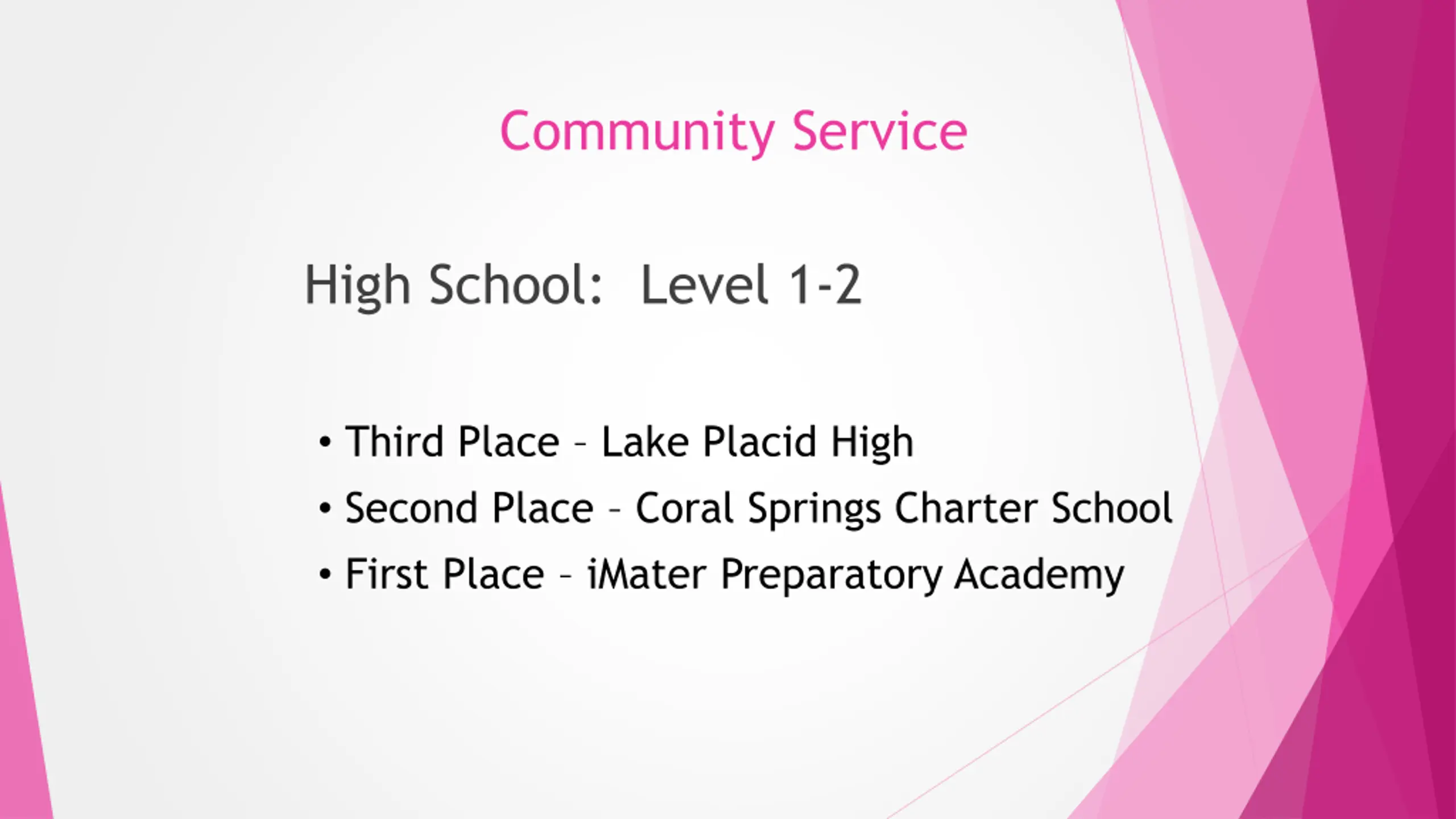 Community Service High School: Level 1-2 Third Place Lake Placid High Second Place Coral Springs Charter School First Place iMater Preparatory Academy