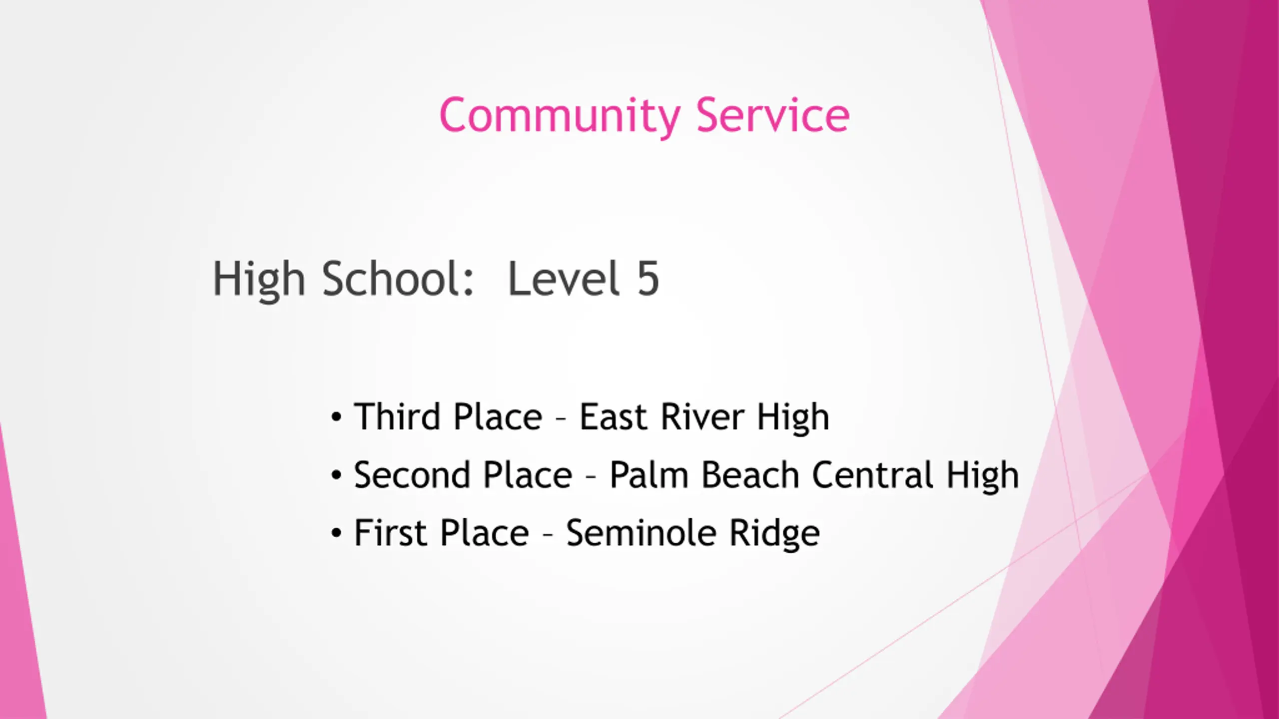 Community Service High School: Level 5 Third Place East River High Second Place Palm Beach Central High First Place Seminole Ridge