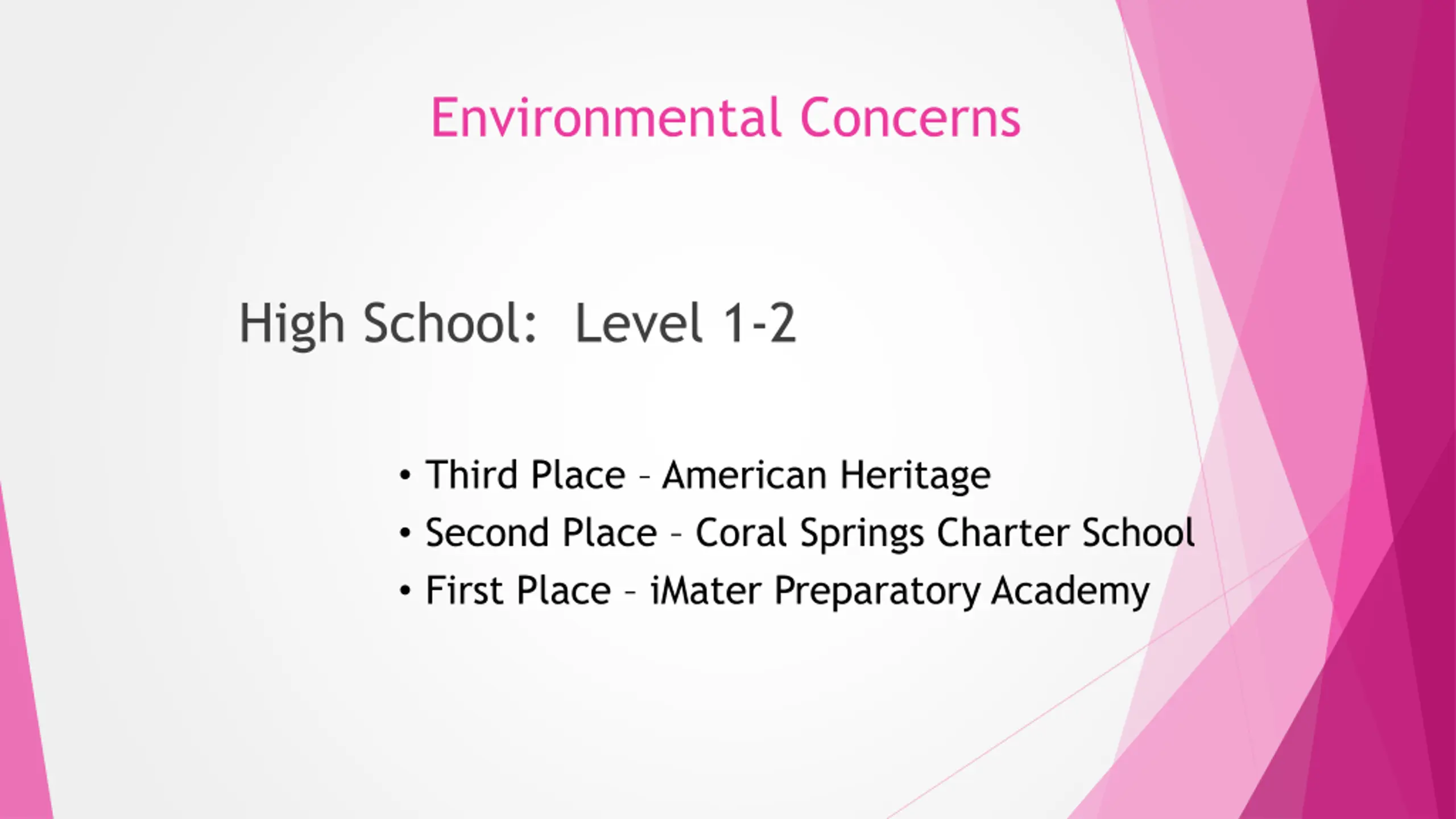 Environmental Concerns High School: Level 1-2 Third Place American Heritage Second Place Coral Springs Charter School First Place iMater Preparatory Academy