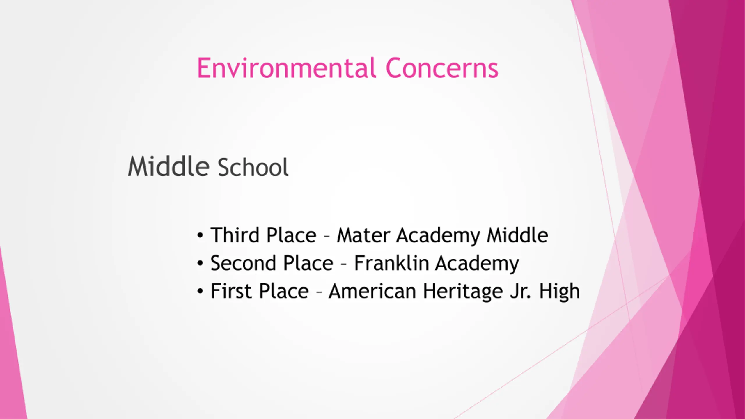Environmental Concerns Middle School Third Place Mater Academy Middle Second Place Franklin Academy First Place American Heritage Jr. High