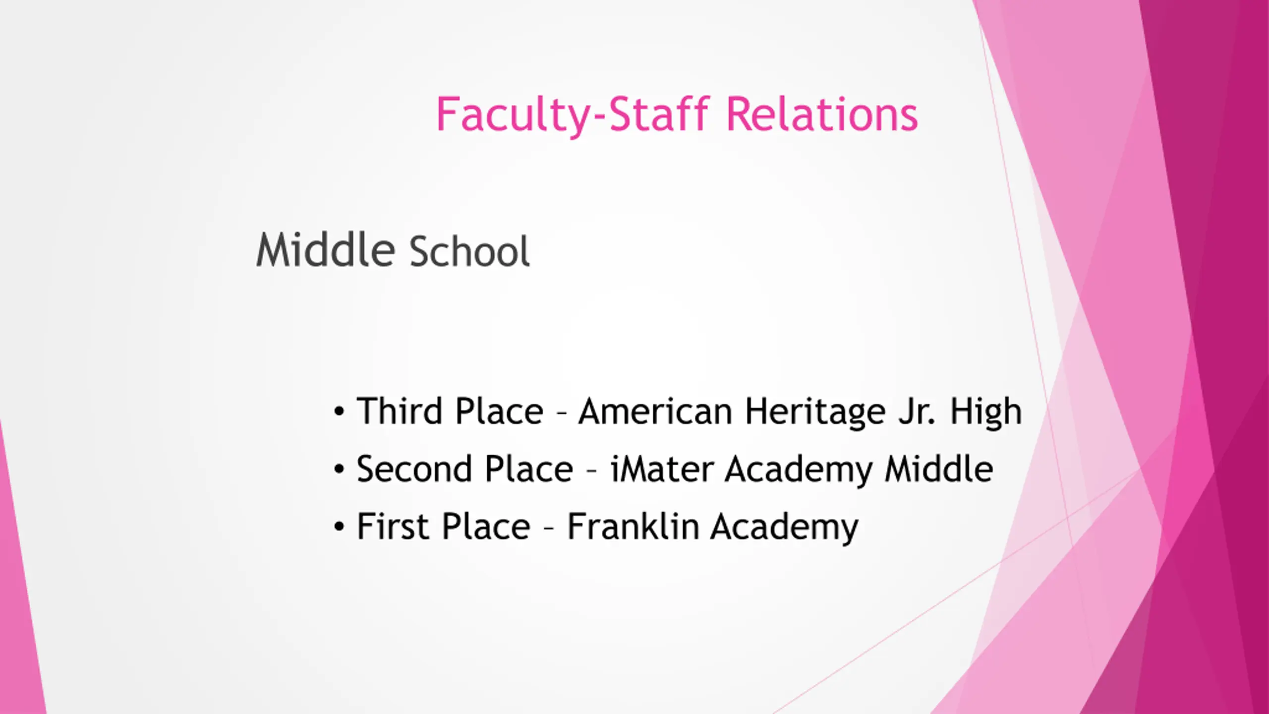 Faculty-Staff Relations Middle School Third Place American Heritage Jr. High Second Place iMater Academy Middle First Place Franklin Academy