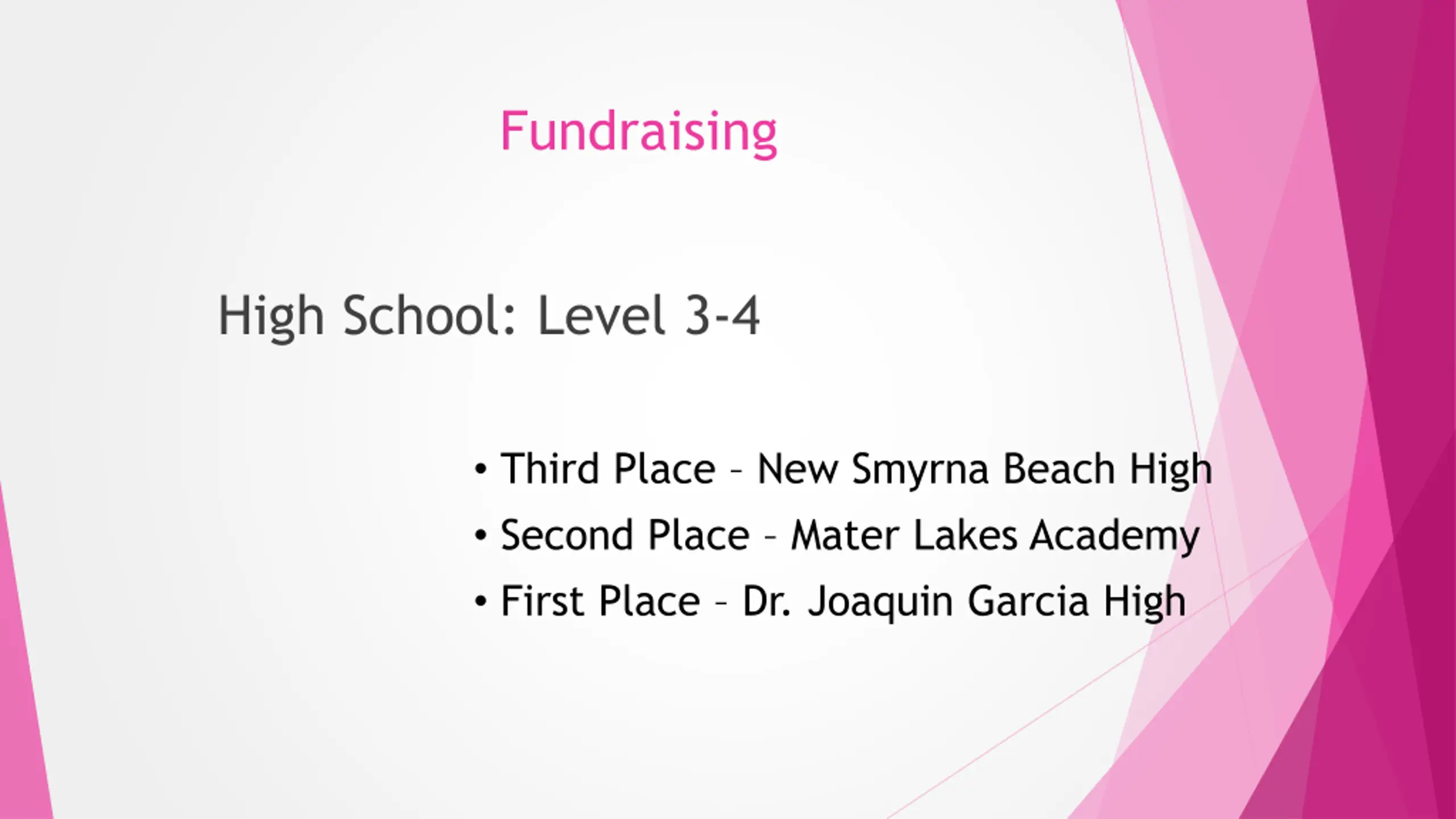 Fundraising High School: Level 3-4 Third Place New Smyrna Beach High Second Place Mater Lakes Academy First Place Dr. Joaquin Garcia High
