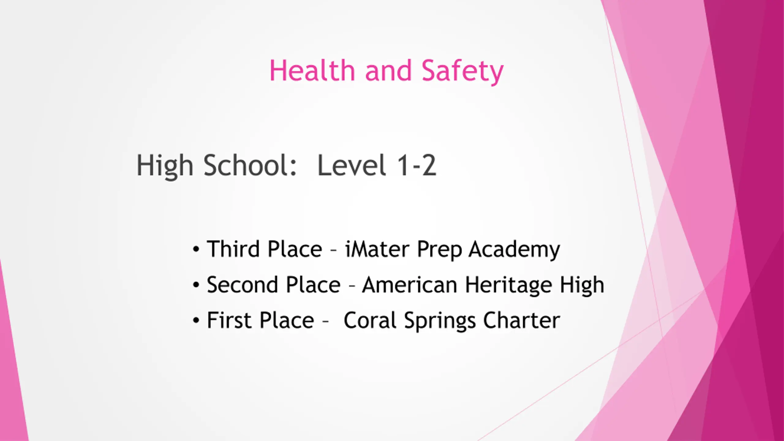 Health and Safety High School: Level 1-2 Third Place iMater Prep Academy Second Place American Heritage High First Place Coral Springs Charter