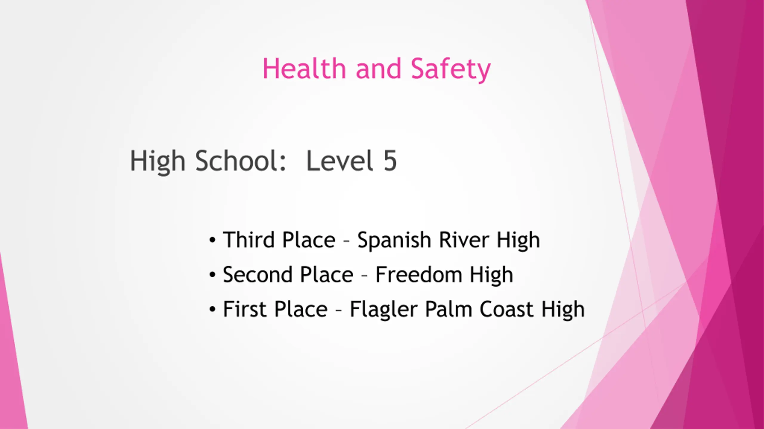 Health and Safety High School: Level 5 Third Place Spanish River High Second Place Freedom High First Place Flagler Palm Coast High