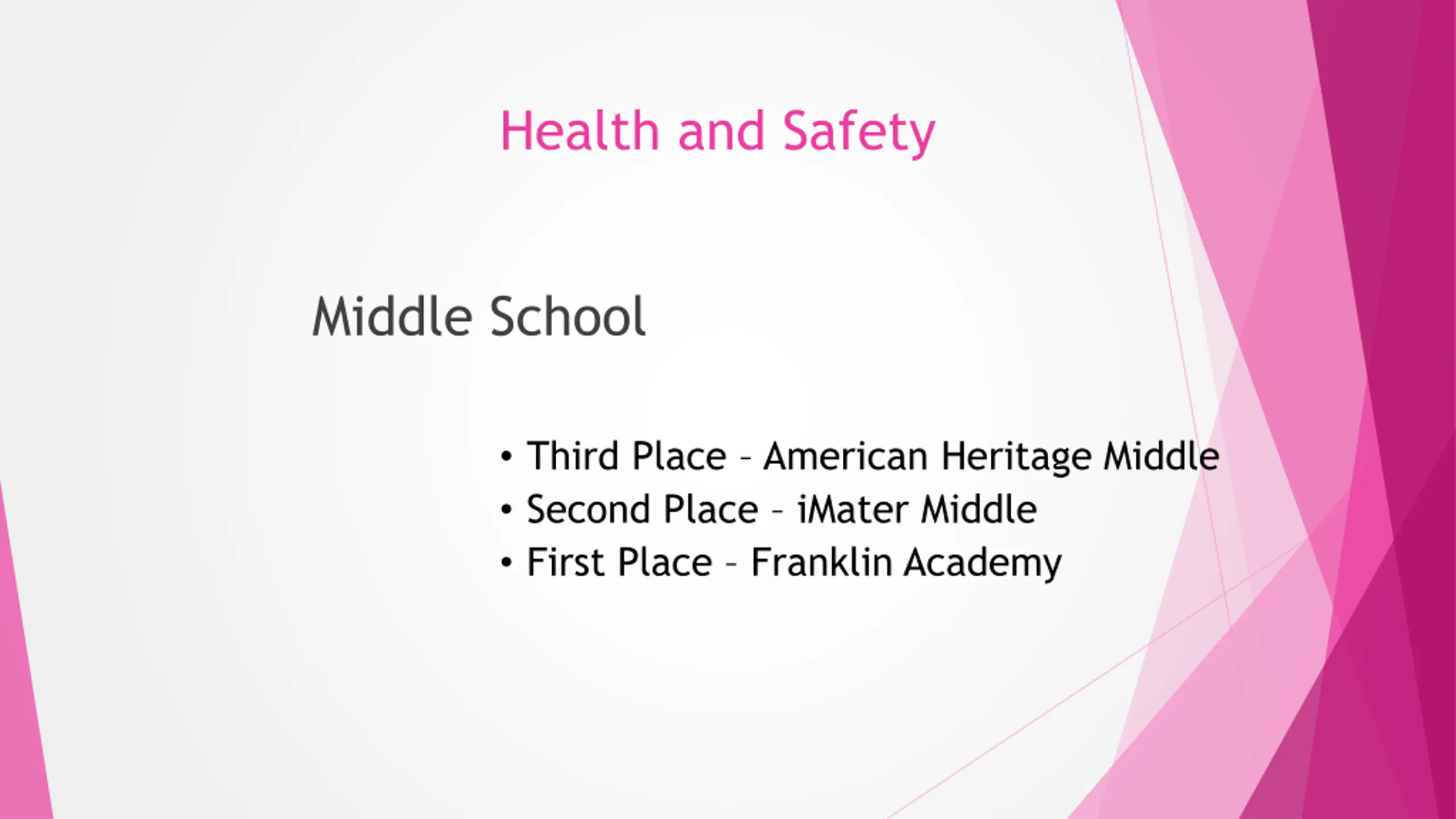 Health and Safety Middle School Third Place American Heritage Middle Second Place iMater Middle First Place Franklin Academy