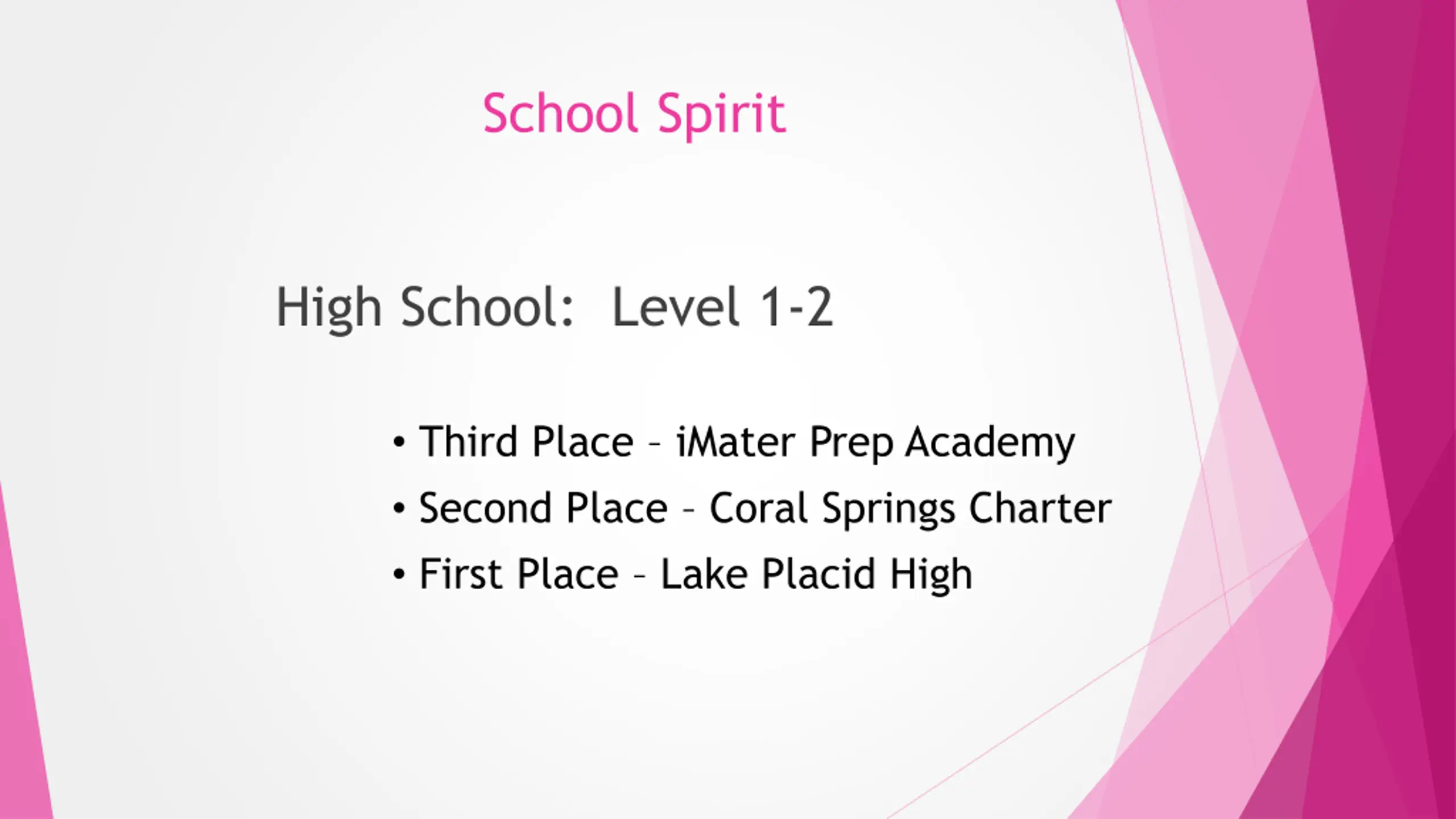 School Spirit High School: Level 1-2 Third Place iMater Prep Academy Second Place Coral Springs Charter First Place Lake Placid High