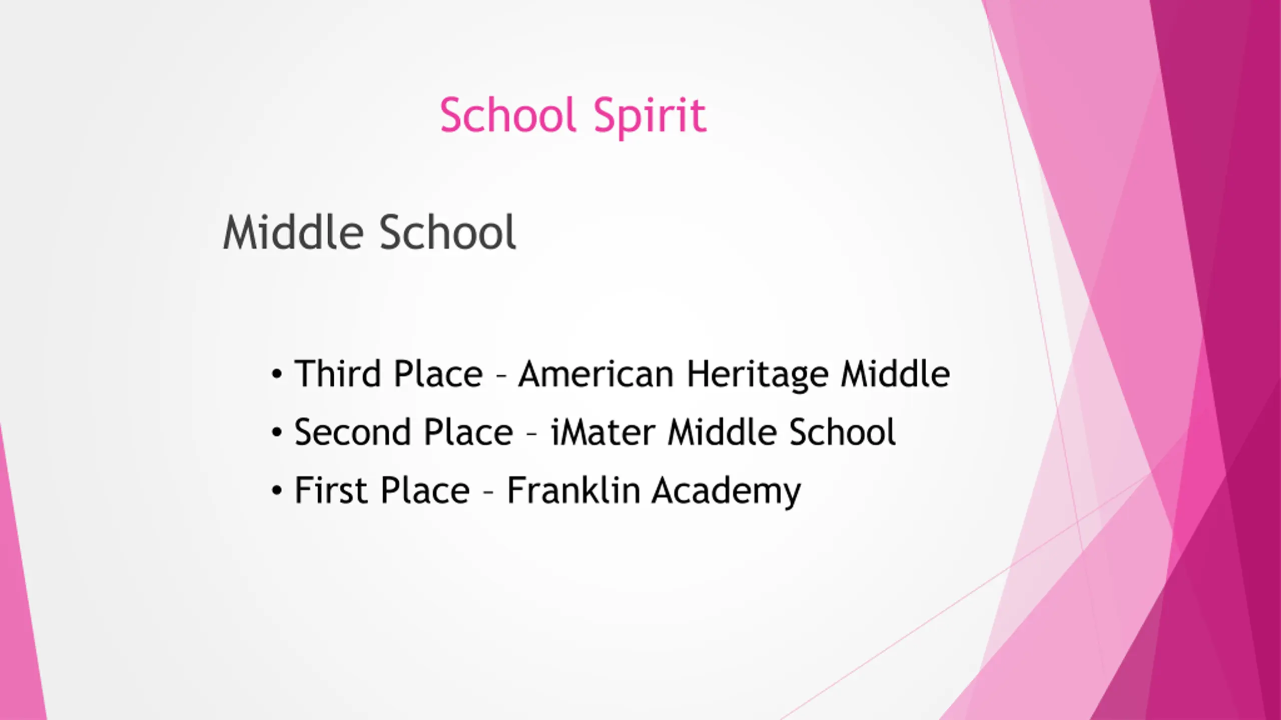School Spirit Middle School Third Place American Heritage Middle Second Place iMater Middle School First Place Franklin Academy