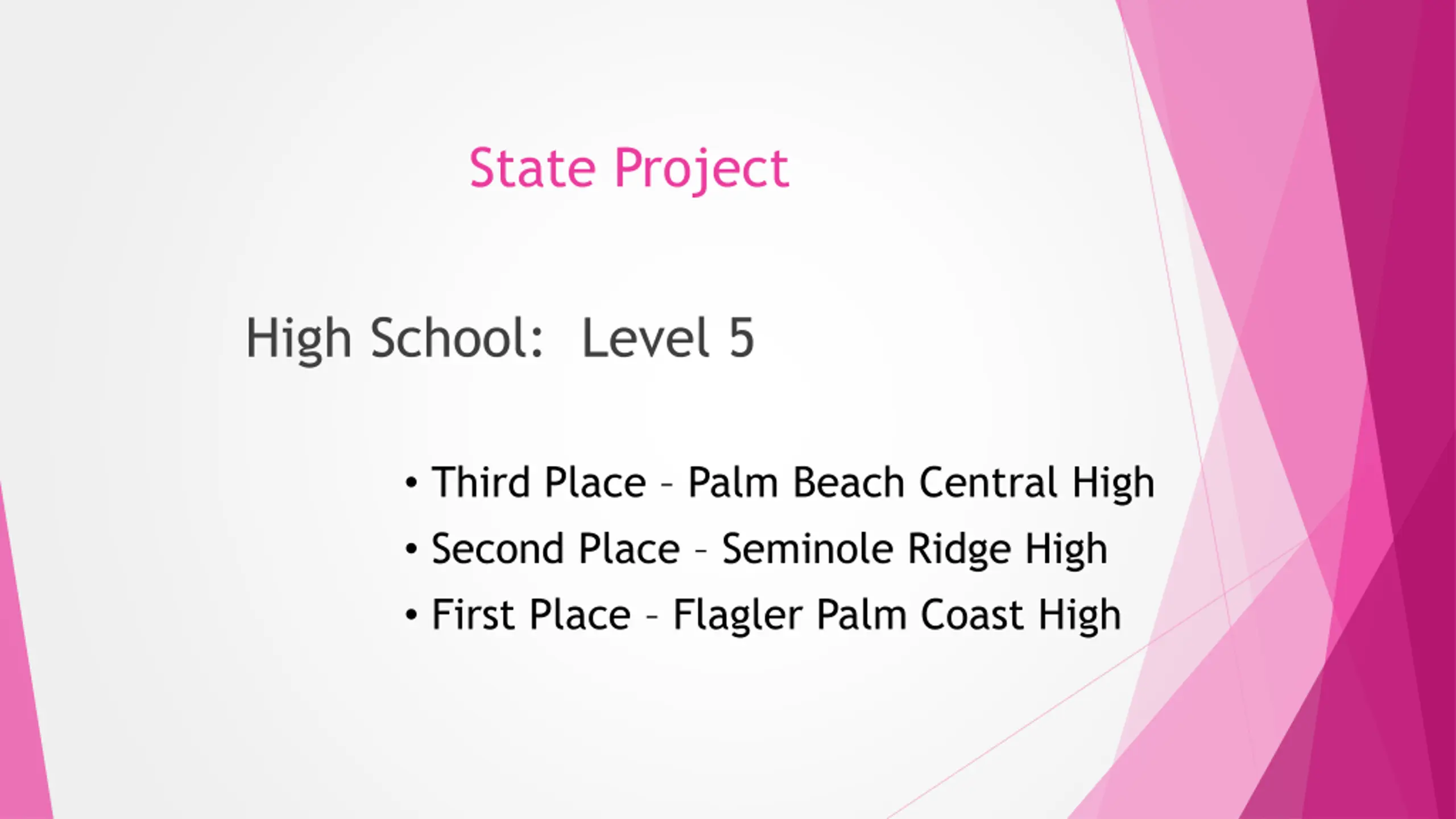 State Project High School: Level 5 Third Place Palm Beach Central High Second Place Seminole Ridge High First Place Flagler Palm Coast High