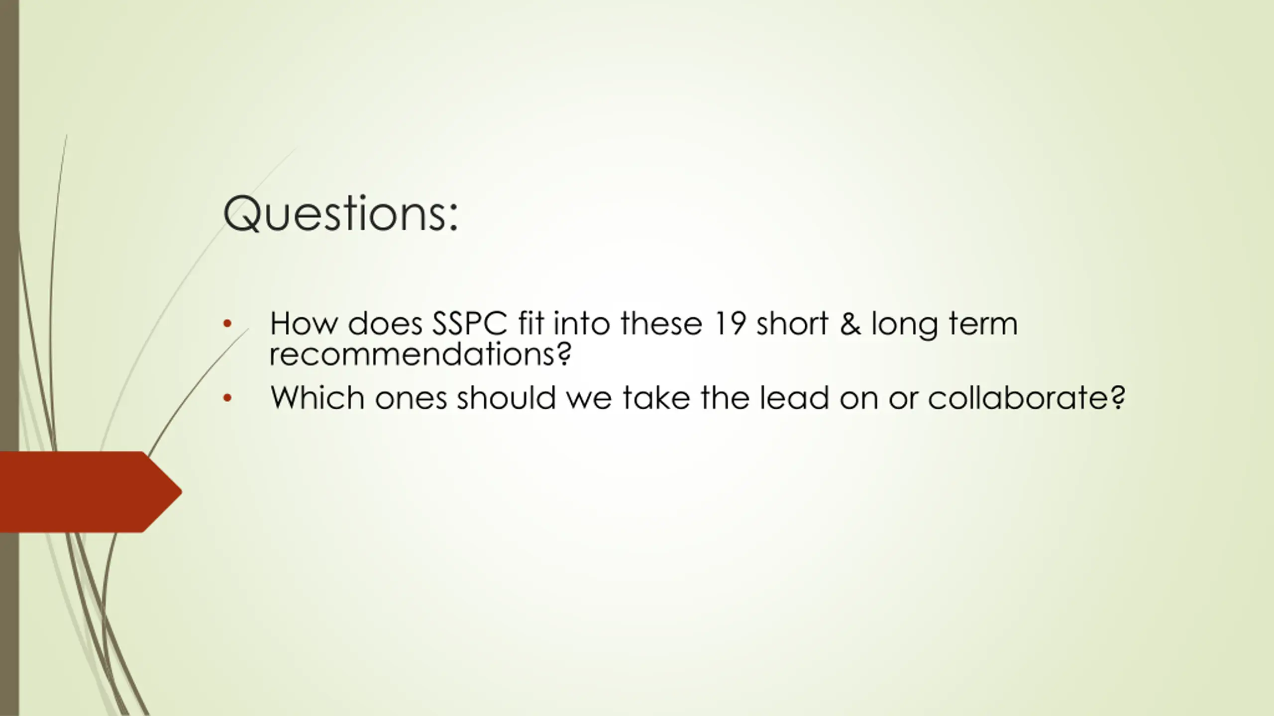 Questions: How does SSPC fit into these 19 short & long term recommendations? Which ones should we take the lead on or collaborate?