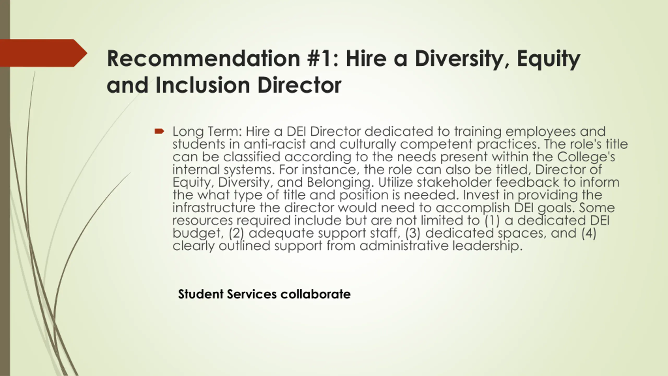 Recommendation #1: Hire a Diversity, Equity and Inclusion Director Long Term: Hire a DEI Director dedicated to training employees and students in anti-racist and culturally competent practices. The role's title can be classified according to the needs present within the College's internal systems. For instance, the role can also be titled, Director of Equity, Diversity, and Belonging. Utilize stakeholder feedback to inform the what type of title and position is needed. Invest in providing the infrastructure the director would need to accomplish DEI goals. Some resources required include but are not limited to (1) a dedicated DEI budget, (2) adequate support staff, (3) dedicated spaces, and (4) clearly outlined support from administrative leadership. Student Services collaborate