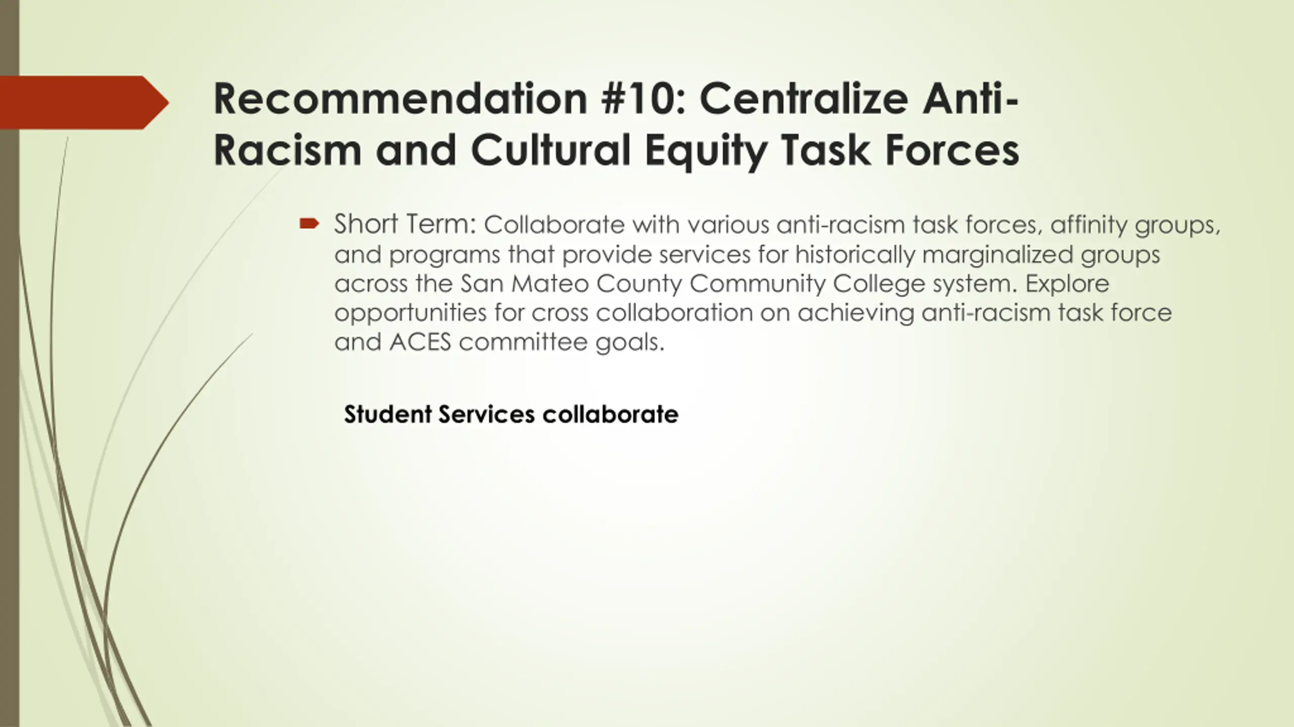 Recommendation #10: Centralize Anti- Racism and Cultural Equity Task Forces Short Term: Collaborate with various anti-racism task forces, affinity groups, and programs that provide services for historically marginalized groups across the San Mateo County Community College system. Explore opportunities for cross collaboration on achieving anti-racism task force and ACES committee goals. Student Services collaborate