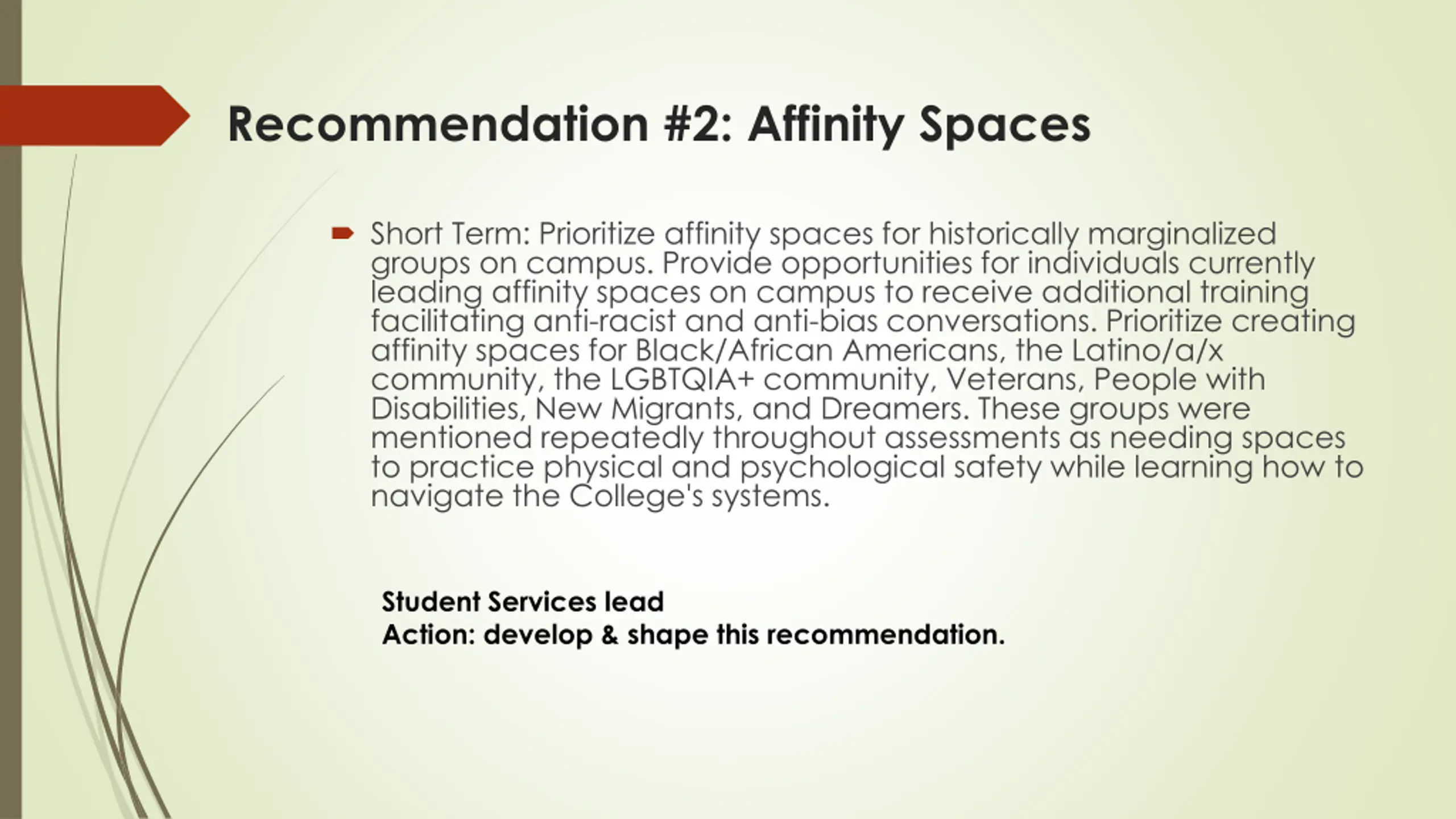 Recommendation #2: Affinity Spaces Short Term: Prioritize affinity spaces for historically marginalized groups on campus. Provide opportunities for individuals currently leading affinity spaces on campus to receive additional training facilitating anti-racist and anti-bias conversations. Prioritize creating affinity spaces for Black/African Americans, the Latino/a/x community, the LGBTQIA+ community, Veterans, People with Disabilities, New Migrants, and Dreamers. These groups were mentioned repeatedly throughout assessments as needing spaces to practice physical and psychological safety while learning how to navigate the College's systems. Student Services lead Action: develop & shape this recommendation.