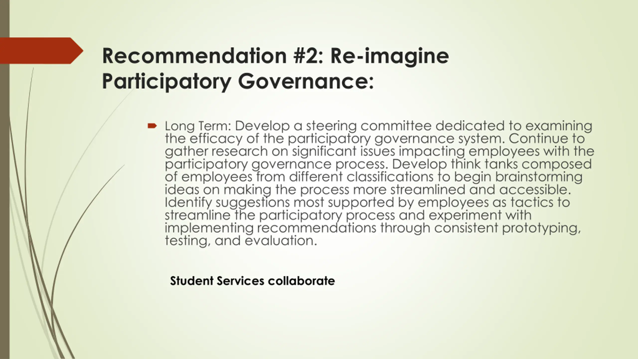 Recommendation #2: Re-imagine Participatory Governance: Long Term: Develop a steering committee dedicated to examining the efficacy of the participatory governance system. Continue to gather research on significant issues impacting employees with the participatory governance process. Develop think tanks composed of employees from different classifications to begin brainstorming ideas on making the process more streamlined and accessible. Identify suggestions most supported by employees as tactics to streamline the participatory process and experiment with implementing recommendations through consistent prototyping, testing, and evaluation. Student Services collaborate
