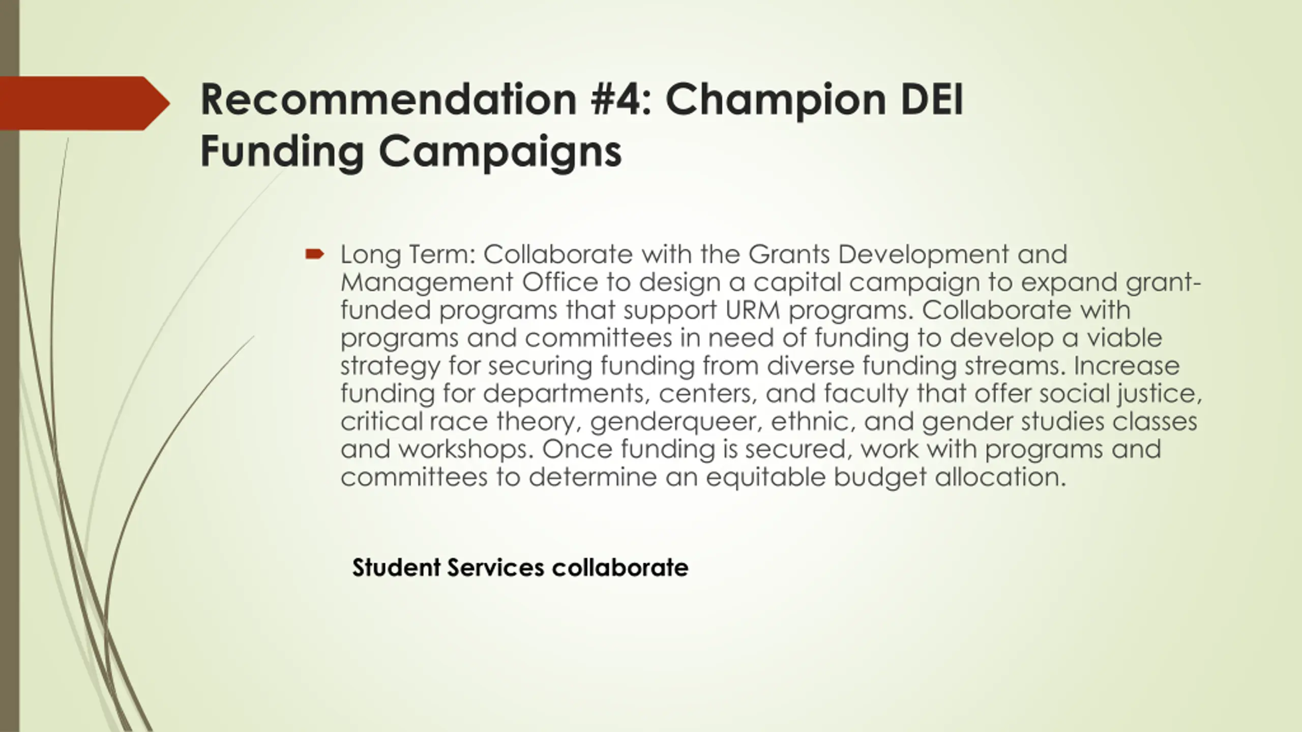 Recommendation #4: Champion DEI Funding Campaigns Long Term: Collaborate with the Grants Development and Management Office to design a capital campaign to expand grant- funded programs that support URM programs. Collaborate with programs and committees in need of funding to develop a viable strategy for securing funding from diverse funding streams. Increase funding for departments, centers, and faculty that offer social justice, critical race theory, genderqueer, ethnic, and gender studies classes and workshops. Once funding is secured, work with programs and committees to determine an equitable budget allocation. Student Services collaborate
