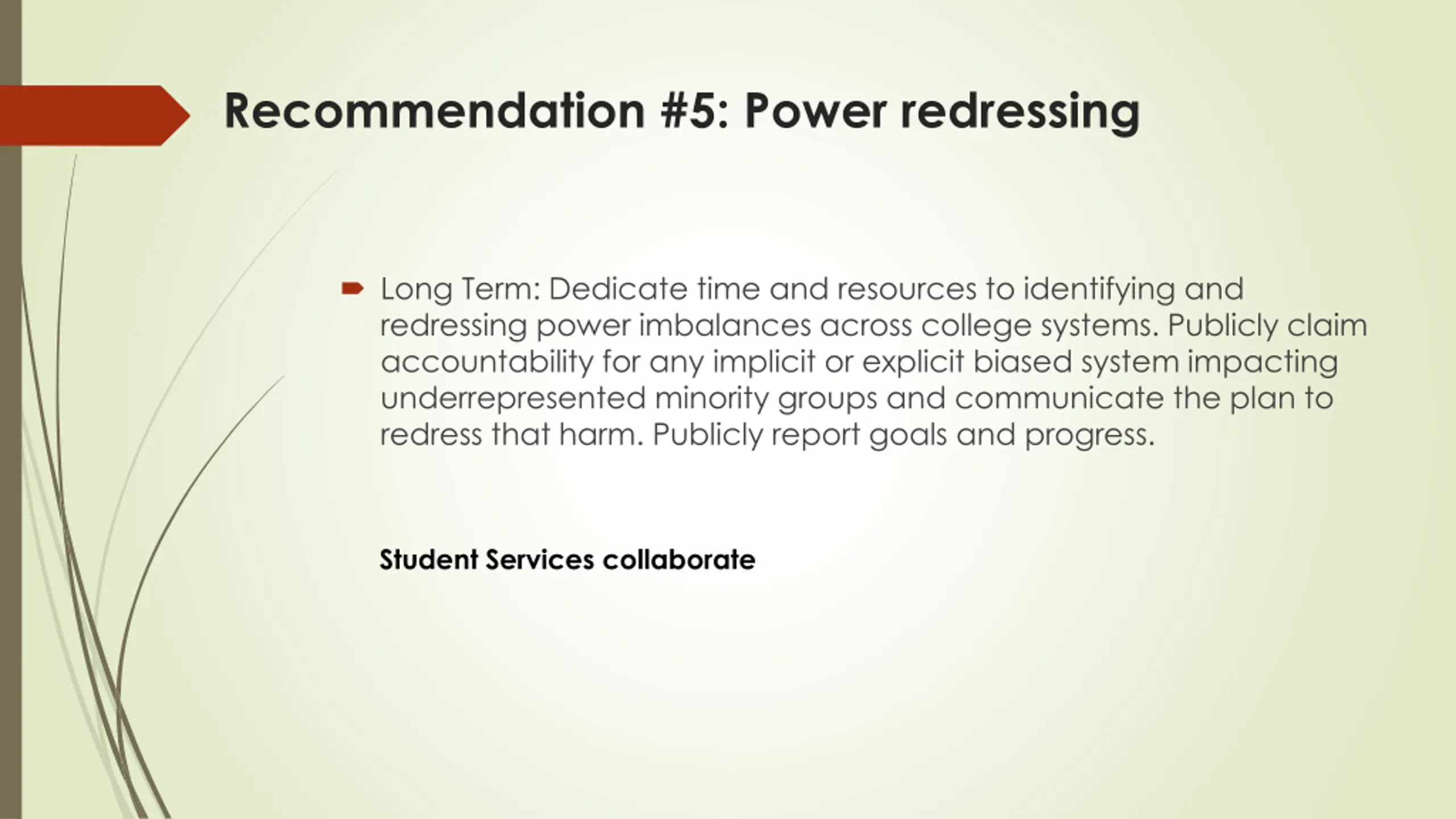 Recommendation #5: Power redressing Long Term: Dedicate time and resources to identifying and redressing power imbalances across college systems. Publicly claim accountability for any implicit or explicit biased system impacting underrepresented minority groups and communicate the plan to redress that harm. Publicly report goals and progress. Student Services collaborate