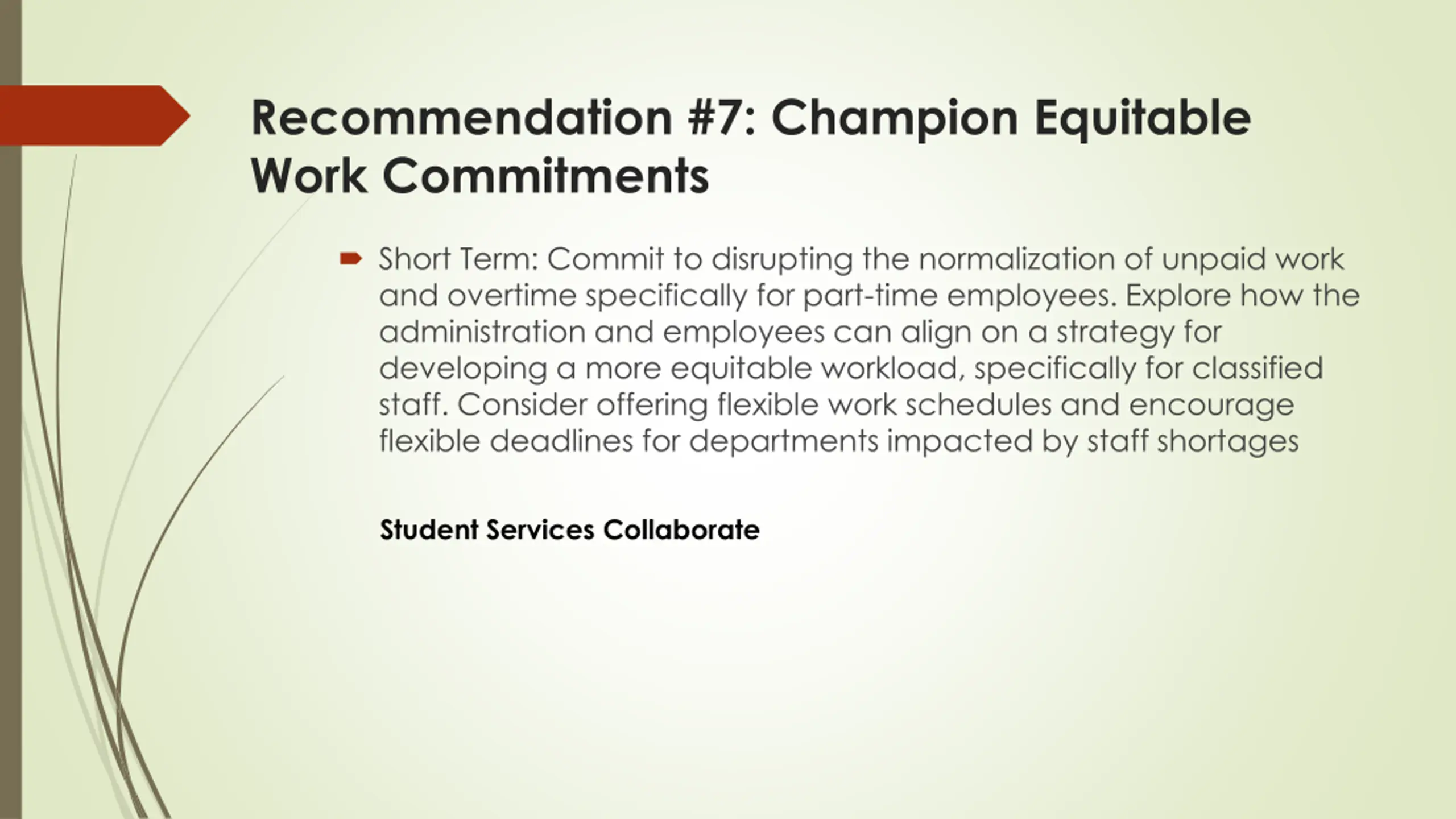 Recommendation #7: Champion Equitable Work Commitments Short Term: Commit to disrupting the normalization of unpaid work and overtime specifically for part-time employees. Explore how the administration and employees can align on a strategy for developing a more equitable workload, specifically for classified staff. Consider offering flexible work schedules and encourage flexible deadlines for departments impacted by staff shortages Student Services Collaborate