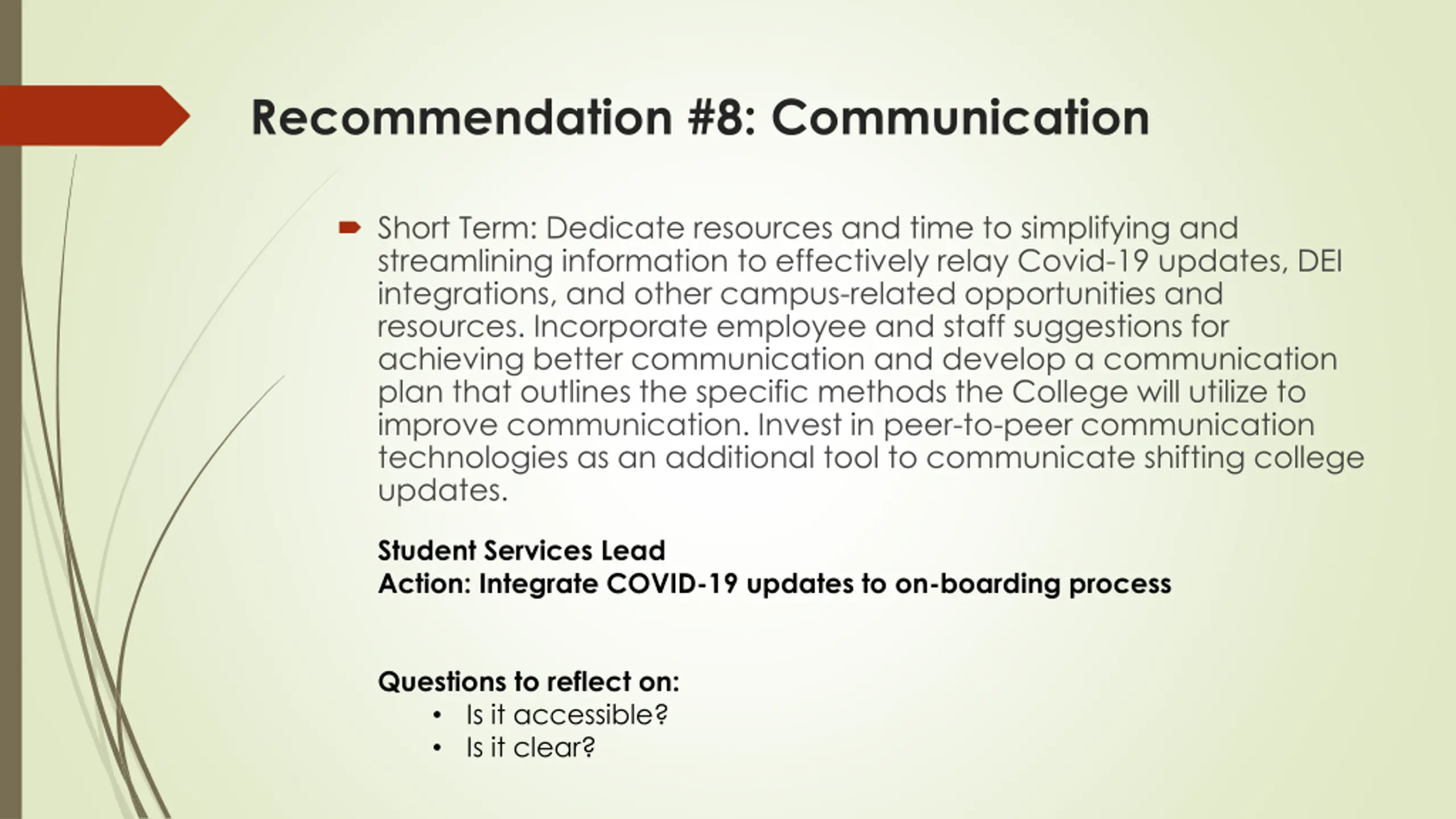 Recommendation #8: Communication Short Term: Dedicate resources and time to simplifying and streamlining information to effectively relay Covid-19 updates, DEI integrations, and other campus-related opportunities and resources. Incorporate employee and staff suggestions for achieving better communication and develop a communication plan that outlines the specific methods the College will utilize to improve communication. Invest in peer-to-peer communication technologies as an additional tool to communicate shifting college updates. Student Services Lead Action: Integrate COVID-19 updates to on-boarding process Questions to reflect on: Is it accessible? Is it clear?