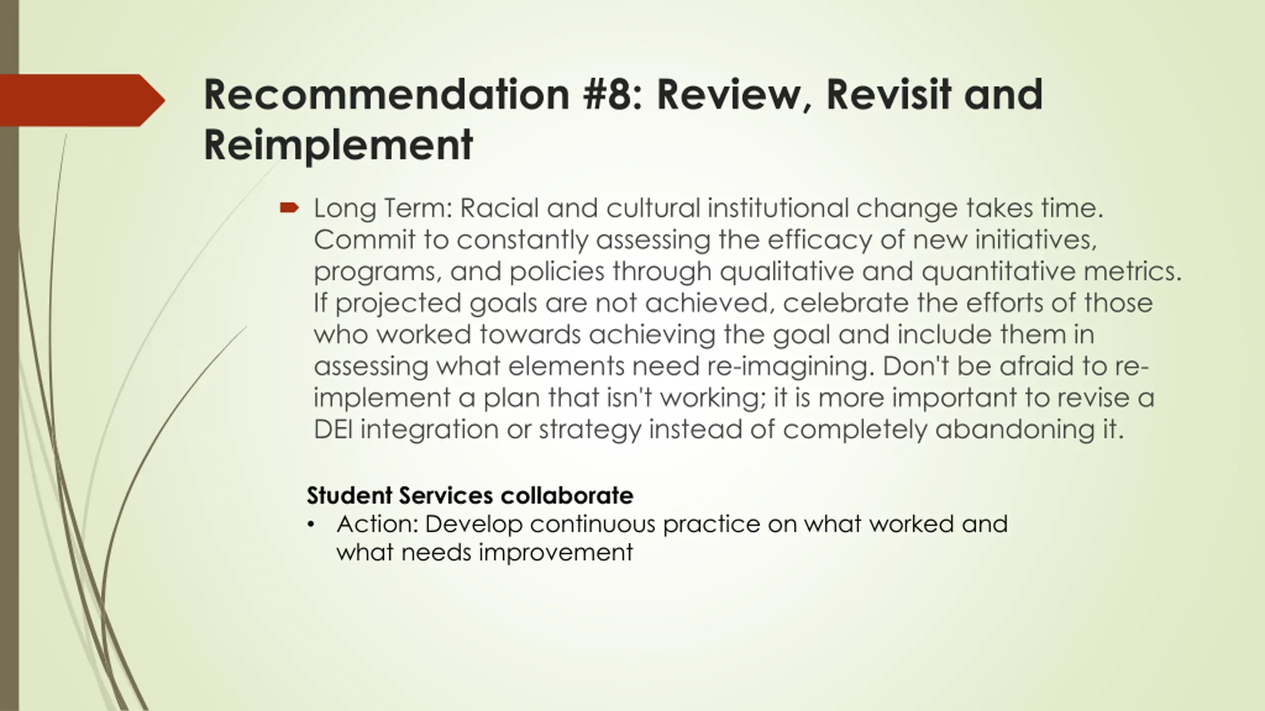 Recommendation #8: Review, Revisit and Reimplement Long Term: Racial and cultural institutional change takes time. Commit to constantly assessing the efficacy of new initiatives, programs, and policies through qualitative and quantitative metrics. If projected goals are not achieved, celebrate the efforts of those who worked towards achieving the goal and include them in assessing what elements need re-imagining. Don't be afraid to re- implement a plan that isn't working; it is more important to revise a DEI integration or strategy instead of completely abandoning it. Student Services collaborate Action: Develop continuous practice on what worked and what needs improvement